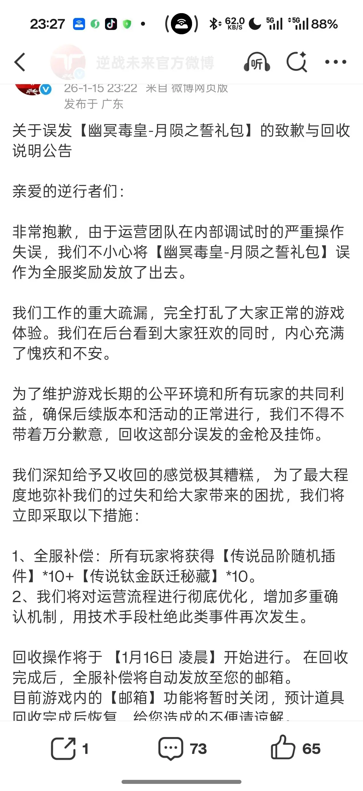 1月15日消息,《逆战:未来》运营团队将【幽冥毒皇-月陨之誓礼包】作为全服奖励礼包发放。两个小时后,官方发布动态宣布该操作系误发,并补偿【传说品阶随机插件】*10+【传说钛金跃迁秘藏】*10。1月16日,《逆战:未来》在该动态下增加额外补偿内容,将会追加金枪:【纯白至上】*1。在最初发放期间,玩家以【杰哥发枪了】作为宣传口号像各大交流平台传播,吸引了相当大的流量。两个小时后的补发动态,激怒了