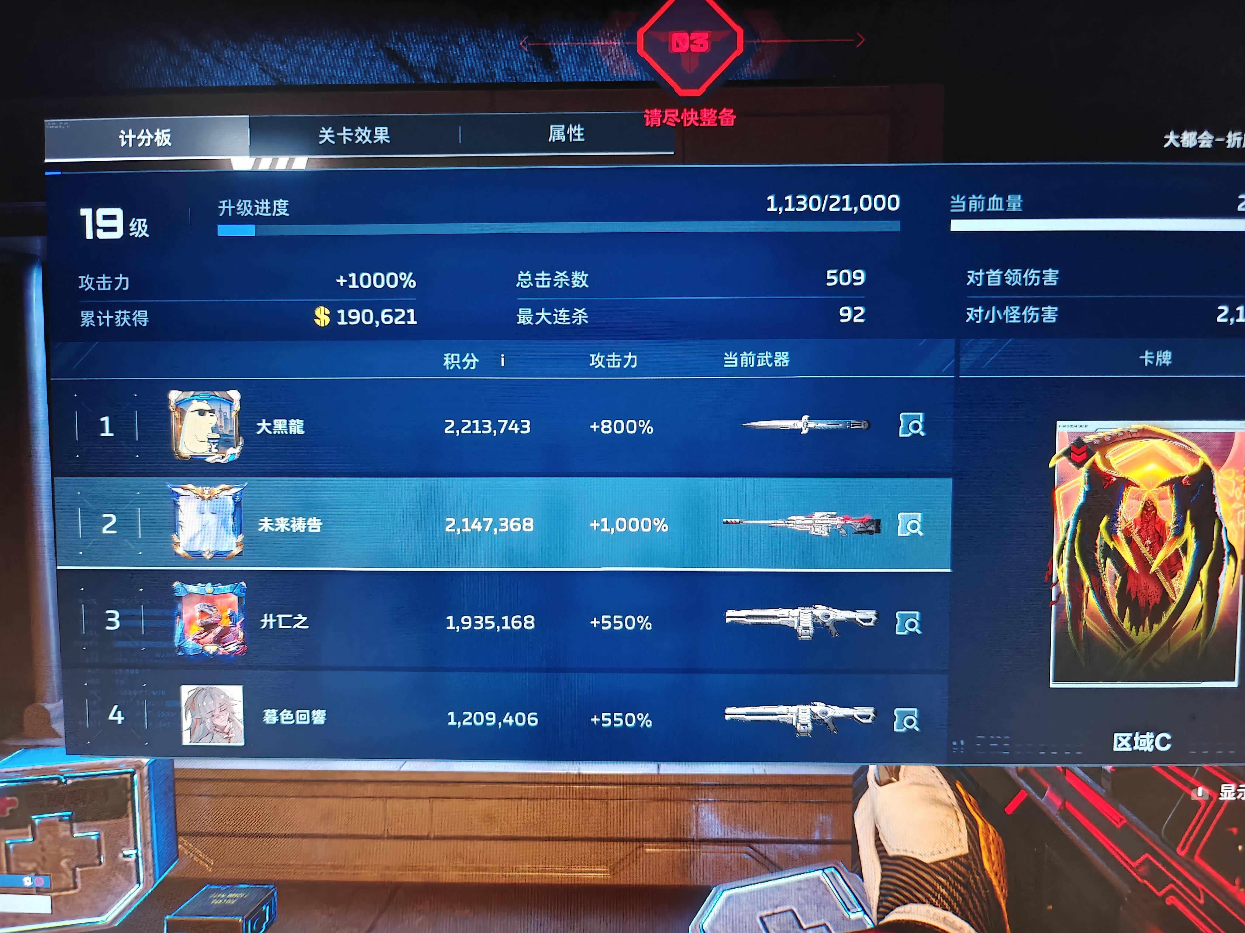 经过多把折磨测试,首先最推荐的枪是死神猎手,如图二,以这把大都会折磨为列,队友一把直伤流满配纯白,一把满配毒皇。对比之下,毒皇刷分最高但钱不多,死神刷钱最高,在分数略低于毒皇的情况下可以做到高毒皇200%攻击力,这套插件的二号闪身可以在折磨难度下保证极高的生存率,虽然没有死神之光,但刷钱效率依旧遥遥领先完全够用。打炼狱可换成弱点充能用死神之光清小怪。四号带归途会让破韧速度提高一倍,对整体刷图效率比