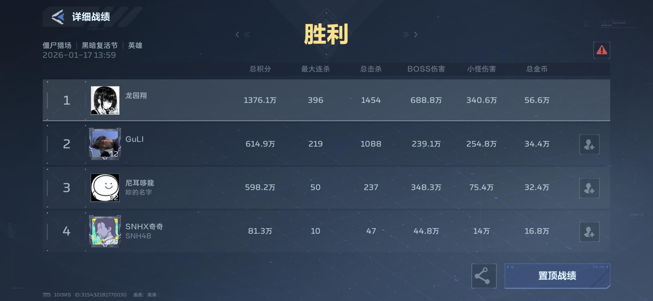 谁知道我经历了什么,我一个常年倒数的玩家第一次打到1500攻击。一局英雄复活节比炼狱大都会打的还久,还差点没打过😩我也没有用炸B武器,道中和BOSS全程用紫色步枪打,队友金枪加金插件为什么打不出输出?尸龙前面那条长道还卡了我们十几分钟,我还以为队友是想刷金币,原来是推不过去😅尸龙前面的守点还被团灭了一次。中途还遇到骸影入侵差点没打过。BOSS战前我还担心他们是没钱升攻击力,我还给两个队