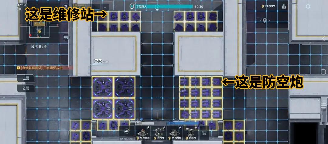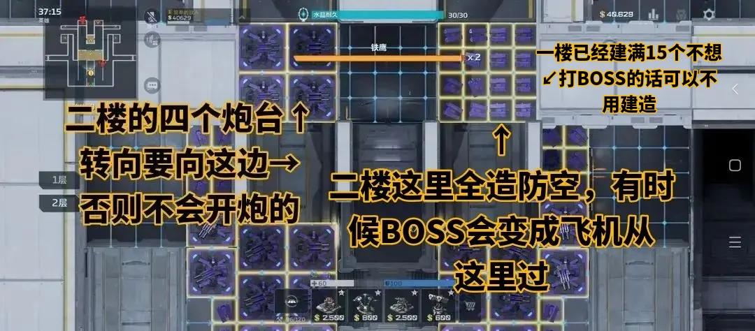 图一图二是一楼图三是二楼图四是boss左右两边踩爆炮台以后,在boss左边右边建造防空炮台就行了不想打就让他扣20血,躺平不打算打BOSS的情况下金币全造磁力墙修理站建到怪物门口,做墙受伤任务拿4级墙第一关开局直接两个堵死路口建造两个修理站两个炮台第二关升级炮台到二级,就开始建防控建议一个防控周边带一个修理站,不然容易被打爆又得动手建防控了第三关堵路的炮台回收卖掉开始按图二建