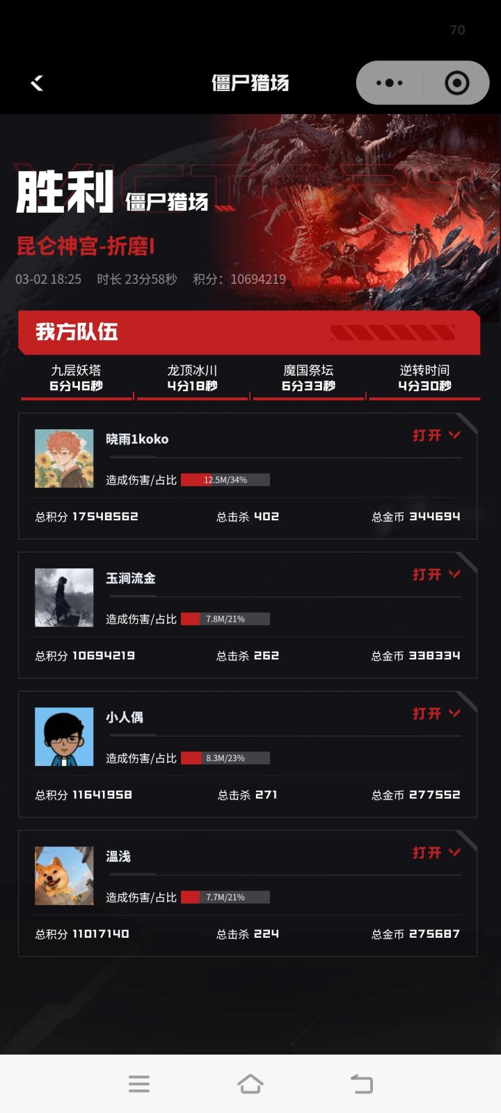 1,2两图是刚刚打的一把,冰我喷的,到了瘤子我打了有两个人就挂机了因为我打爆了瘤子他们刷不了分,到了狼王守关,有两个人直接去门口守着,我自己开了一个机关,有一个队友想开一个机关怪多死了几次,然后退了,乐伊是后面进来的剩下两个机关都是他开的,他进来我就说了有两个挂机的,他还是去开机关了,我72万金币是因为冰窟我就一个守一边加黑手,然后另一边守不住团灭了一次,第二次6万金币,瘤子又给了6万,守关我直接