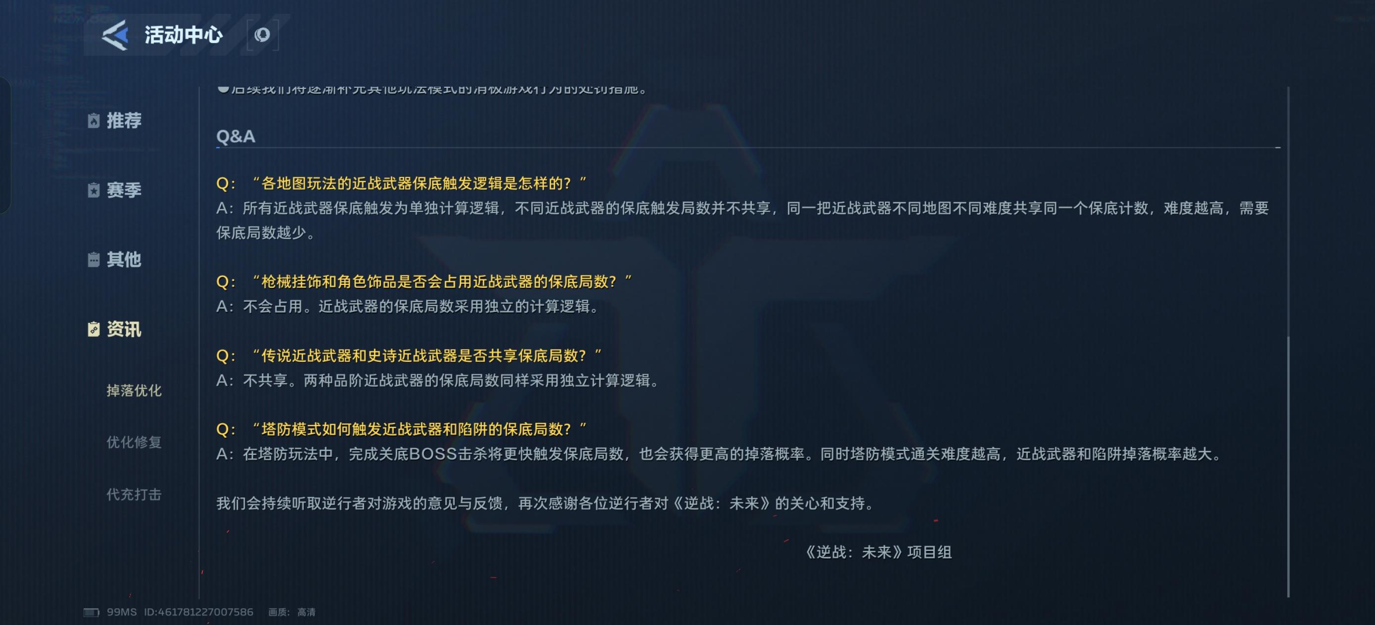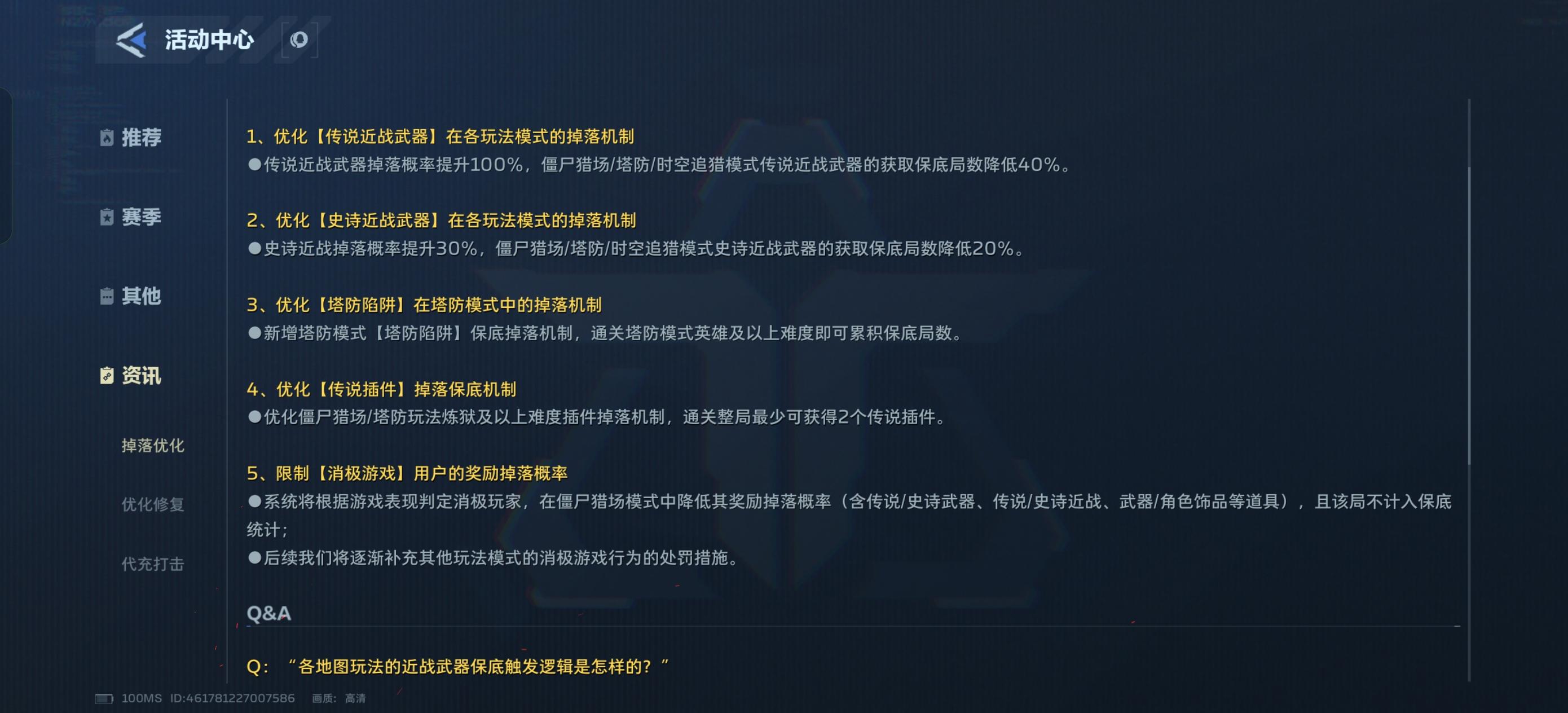 一.“传说近战武器掉落概率提升100%,获取保底局数降低40%”。问题来了,原本的概率是多少?我们又怎么确定他真的提升了这么多?退一步说,假设他没有骗人,他真的提升了这么多,那从万分之一,提升到万分之二,也是100%的提升,那感知强烈吗?不强烈二,只有塔防模式标明了通关英雄难度以上会累积保底局数,并且说明了完成BOSS击杀会更快保底,爆率也更高。更快是多快?更高是多高?其他模式是从什么难度往上开