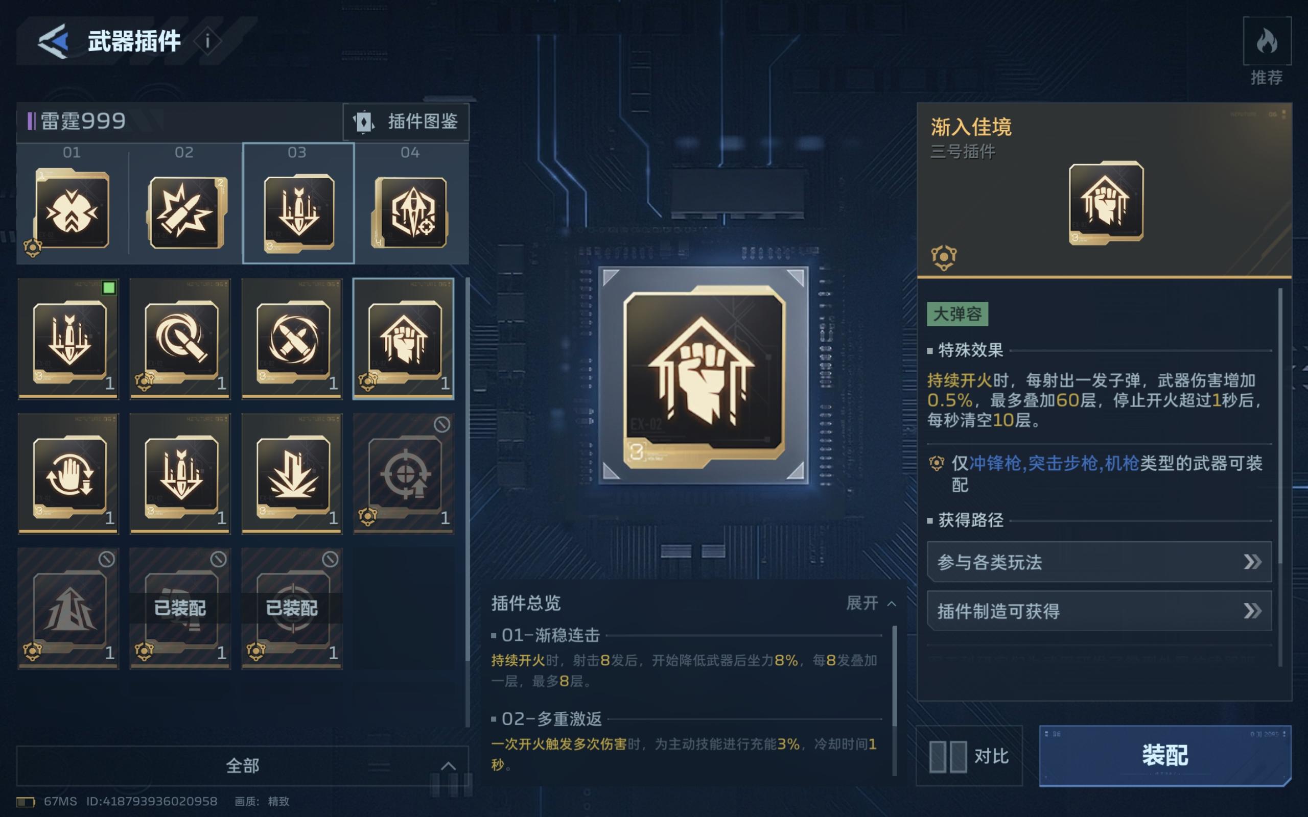 主武器:雷霆999插件①渐稳连击②川流不息③渐入佳境④杀戮连锁雷霆999最有争议的是三号插件,有些博主推荐用(递进膛压和过载膛压)我建议是带渐入佳境,过载镗压与渐入佳境叠满同样是30%增伤,但是打BOSS你需要切刀来躲BOSS技能,切刀或死亡你的增伤效果直接就清除了,过载膛压叠加速度要比渐入佳境慢很多,可以当做下位替代。递进镗压叠满有50%增伤,但是需要击杀小怪,后期BOSS就一个,这个