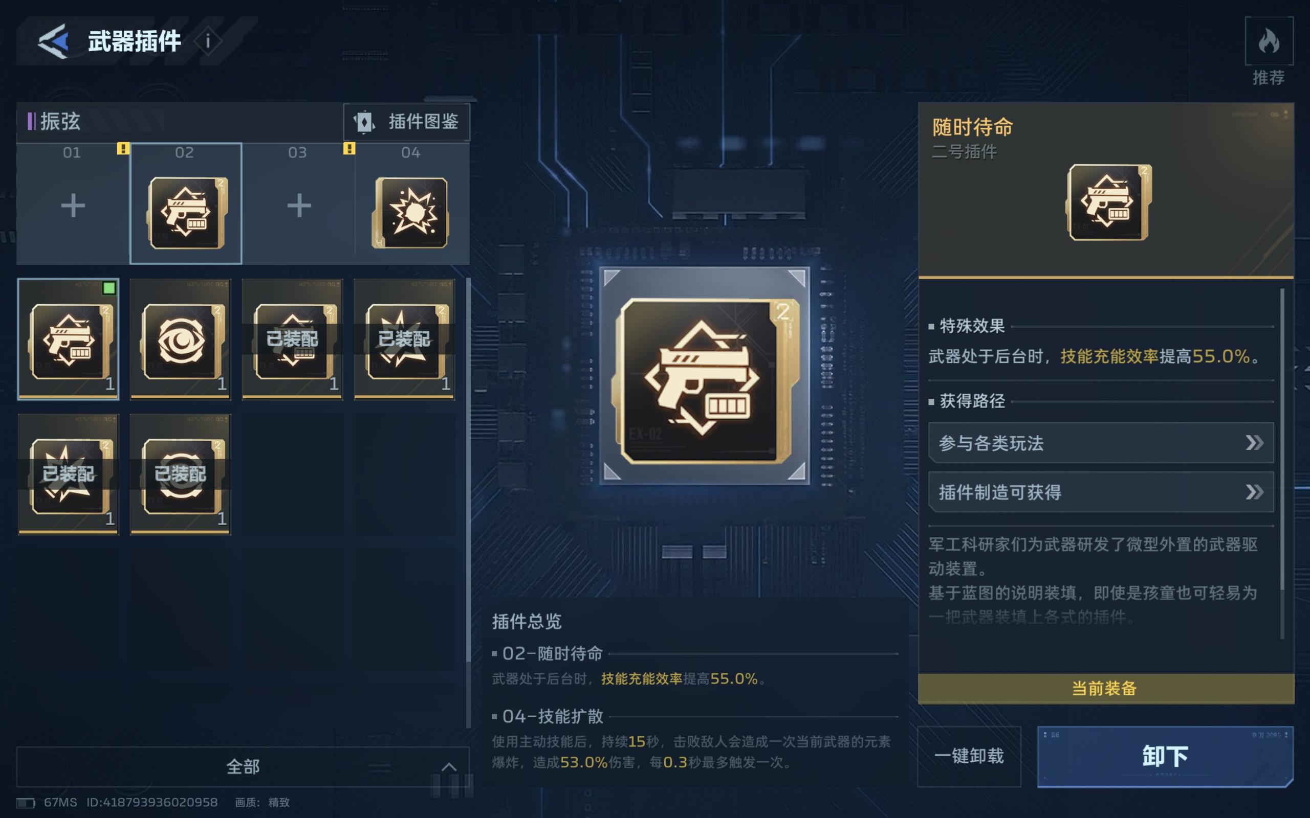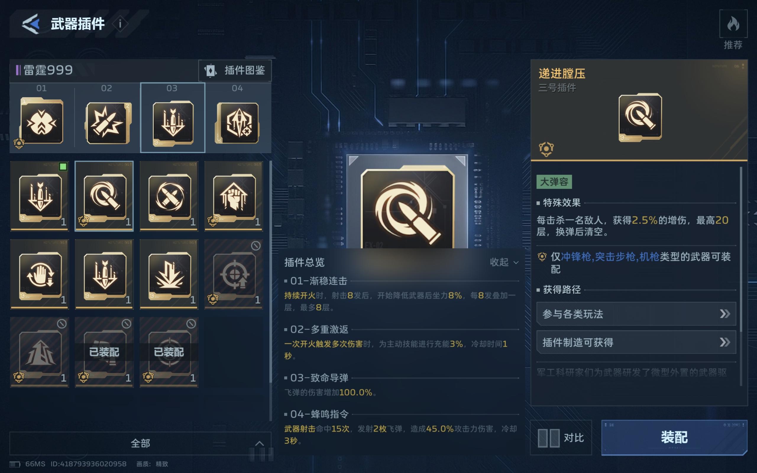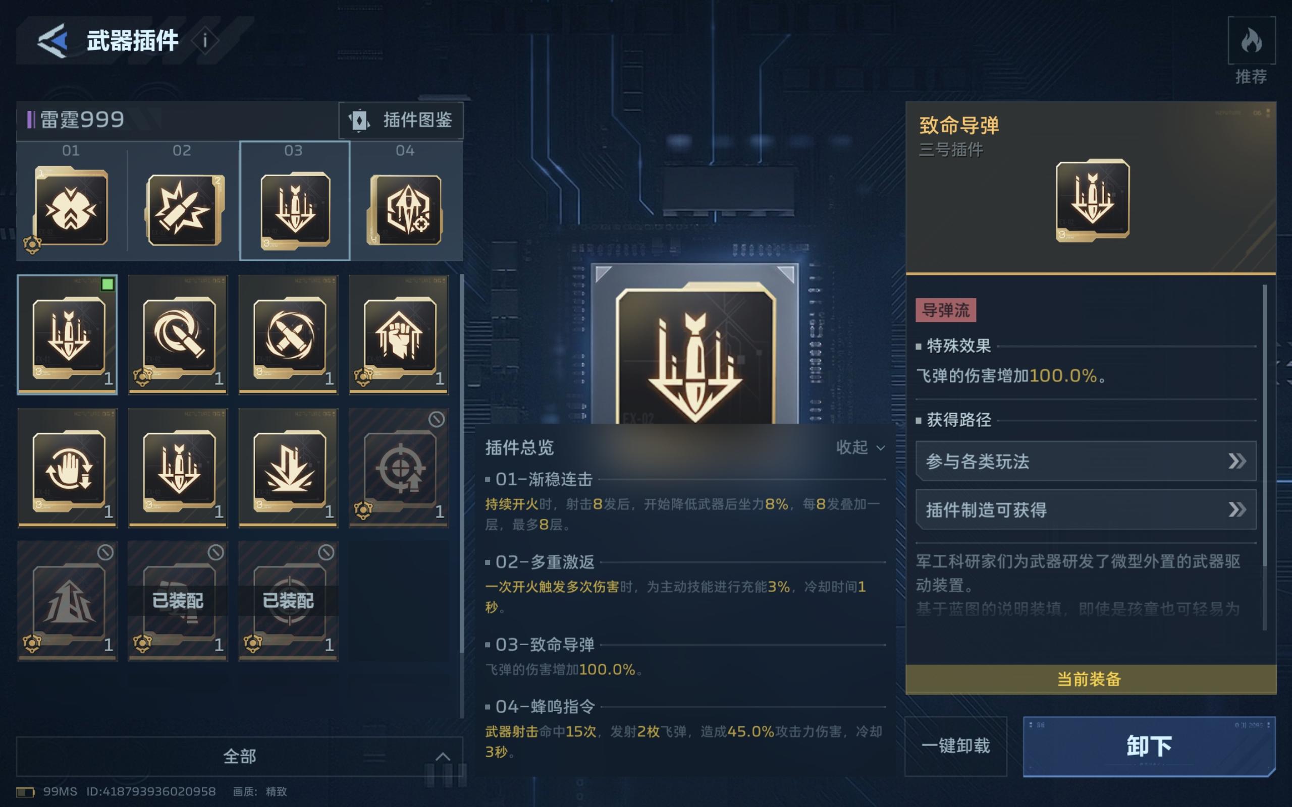 如图展示,插件的选择就这四个,能让你在boss削弱期,打一管血以上,能为之抗衡的只有满配死神,以及34号位同插件的黎明之光,和满配裁决之眼,但差距不会太大,至于为什么要选择导弹,而不是叠加伤害的,递进50%的伤害增幅是非常可观的,但这个插件是有bug,描述是换弹才会消失,实际是你切换武器就消失了,以及不能死亡,死亡就得重新叠,尤其在打boss的时候,死一次就废了,想叠也叠不了,渐入得打60发子弹才