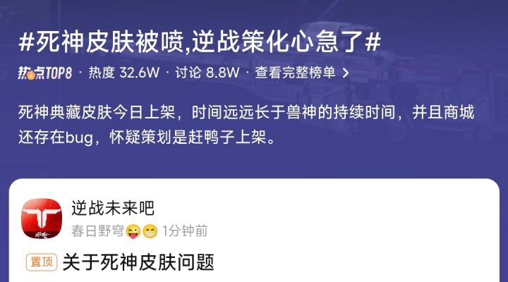 由腾讯天美J3工作室群琳琅天上团队研发的近未来科幻第一人称合作闯关射击游戏《逆战:未来》,刚推出的死神皮肤竟然被家人们给喷上热搜了,这真的是让人没想到啊之前逆战不是出死神皮肤流水暴涨了一波嘛,没想到这皮肤的流水表现和大伙看法完全相反。看了一圈大家吐槽的点特别多,有人发现换弹速度比原皮快,还有人说动画卡顿、特效塑料啥的,此外还有道具未到账bug,这个就很离谱了难怪这次皮肤被网友怀疑赶鸭子上架,