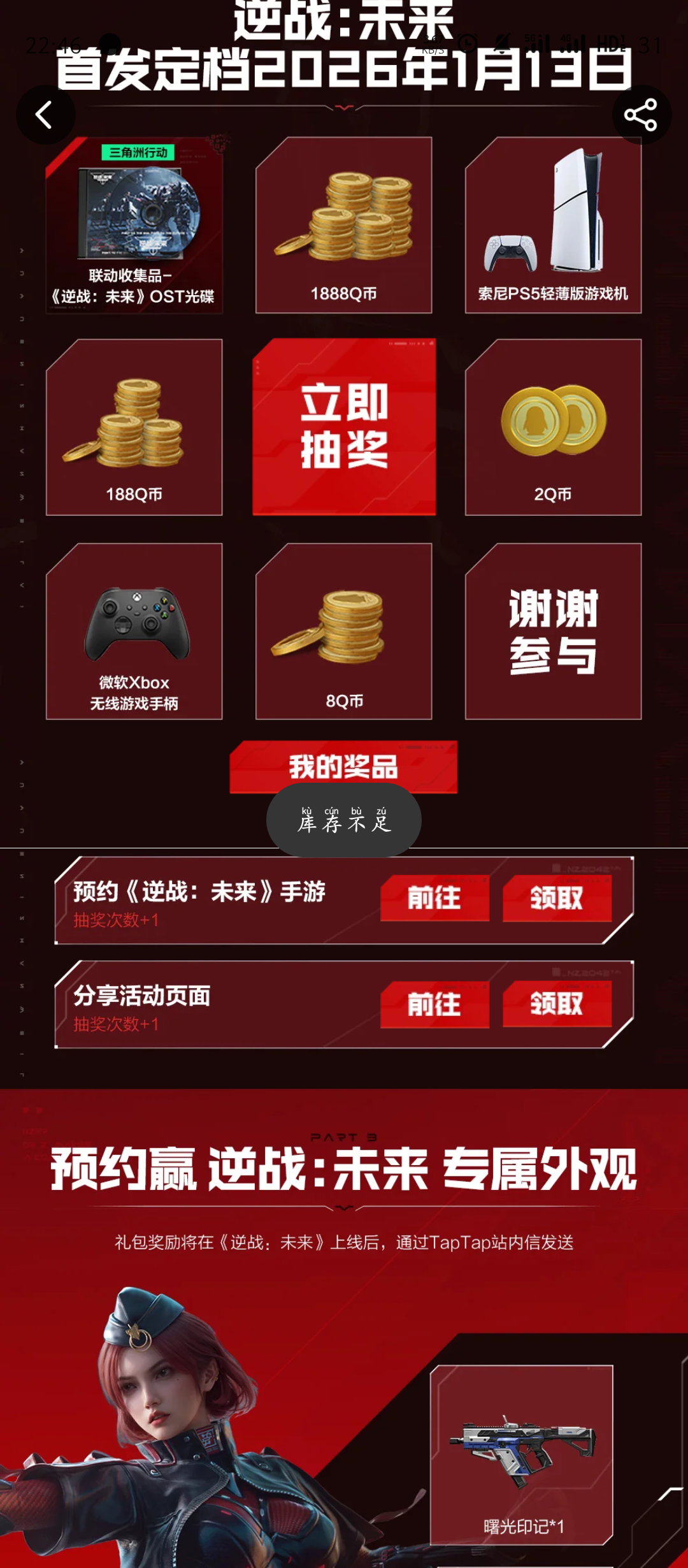 连个预约活动都做不好还指望做好游戏?演都不演了,虚拟积分也整限量是吧?抽奖给个谢谢参与我都不说啥,毕竟我是中奖绝缘体。你现在连参与抽奖的机会都不给,恶心人呐?原本想玩一下的,这下可以说拜拜了