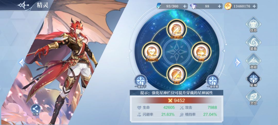 智慧王者.帝释天 星神:pvp就我这套星神,不管是王天主c打输出还是王天副c打辅助效果都是很好的,我的建议是不要换。pve的话如果你王天是主c打输出可以气势换暴击,如果是副c打辅助可以格挡换暴击 灵纹:pvp王天的灵纹配置有两套,第一套是主c输出流,就是叠超杀加伤普攻加伤以及破击词条;还有一套就是副c辅助流,就是选择格挡防爆减伤这一类词条。pve的话王天就四噬电,然后剩下的一个灵纹带加伤以及暴击词