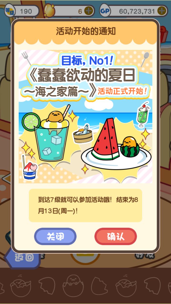 今天中午登录了蛋黄哥,居然开了大型活动!!!(更新请在google play下载)时间:8月2日——8月13日14点(北京时间)出了新的5个菜谱,限定厨具铁板,床边景色也变成了海滩,到达一定程度还会送东西,最终目标是在自己区的排名!前500送的主题太可爱了!!玩法是做限定厨具菜谱的料理,有1小时的3种,6小时的2种,按图来看,同样是6小时,性价比最高的是西瓜蛋黄哥,6小时720贝壳,然而需要