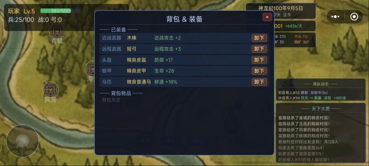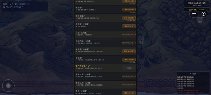 V28更新内容1、添加ai势力与玩家开战后会主动议和的功能(未测试,有问题请告知)2、添加任务系统目前只做了简单主线和一个支线,之后会丰富任务内容,先把功能做出来占个位置3、重新设计了防御机制4、重新设计了初始士兵队列5、提升了ai势力成长6、加入了战场讯息功能7、加入了大地图移动视角功能(手机版已实装,右侧屏幕拖动移动视角,pc好像还有点问题)8、数值平衡性调整