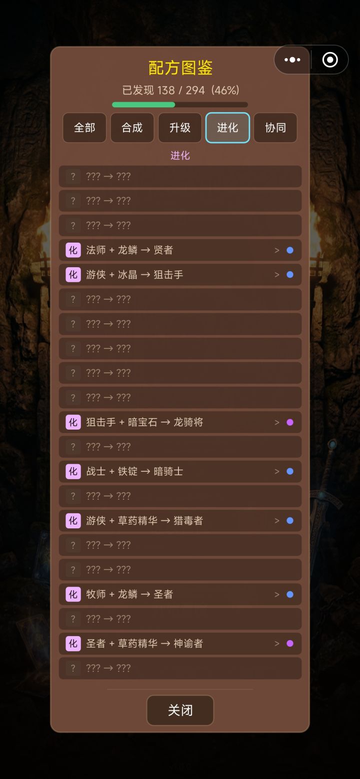 首先声明,我不愿意不看帖子里的合成图,且我也不喜欢游戏中看广告复活,因为感觉像是剧透一样。此外,以下内容针对还没上手的玩家,对于大佬请一笑而过吧1,职业潜力,当你不知道这个职业强不强时,你可以先点开当前职业的合成(长按英雄)如果出现俩条以上,说明他有升级职业,如果只有一条恭喜你到头了(德鲁伊:可恶啊!我的上位呢!)不过想来后续作者会更新上的。2,前期不要去用消耗品资源例如冰晶火