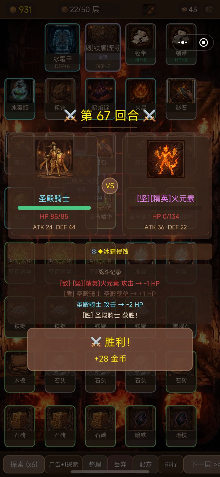 感谢各位探险者踊跃体验并提出宝贵改进意见,现已经对目前发现的一些问题进行了修复和更新,具体如下:1.修复了铁匠事件卡死问题2.修复了装备强化等级回退问题3.修复了伤害结算问题(buff/debuff累积导致人物数值和显示不符)4.修复了药水获取问题5.其他一些小问题修复新增功能:1.丢弃-现在可以批量丢弃道具了,避免游戏到后期资源占满屏幕的问题。当然这是临时之计,后续会追加更多合成路