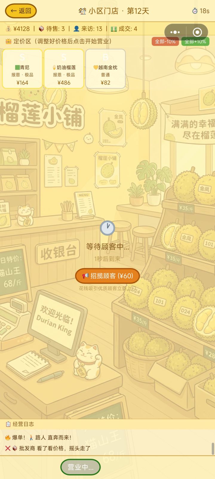 如果开到了SS或SSS级的榴莲就不建议多开了,容易卖不完(因为客户都想要高级的但是嫌贵)