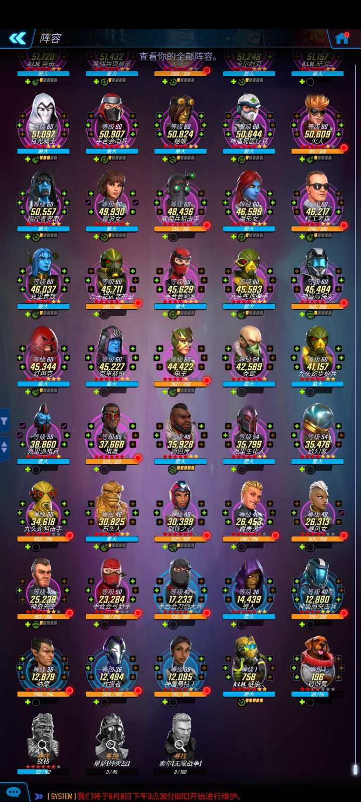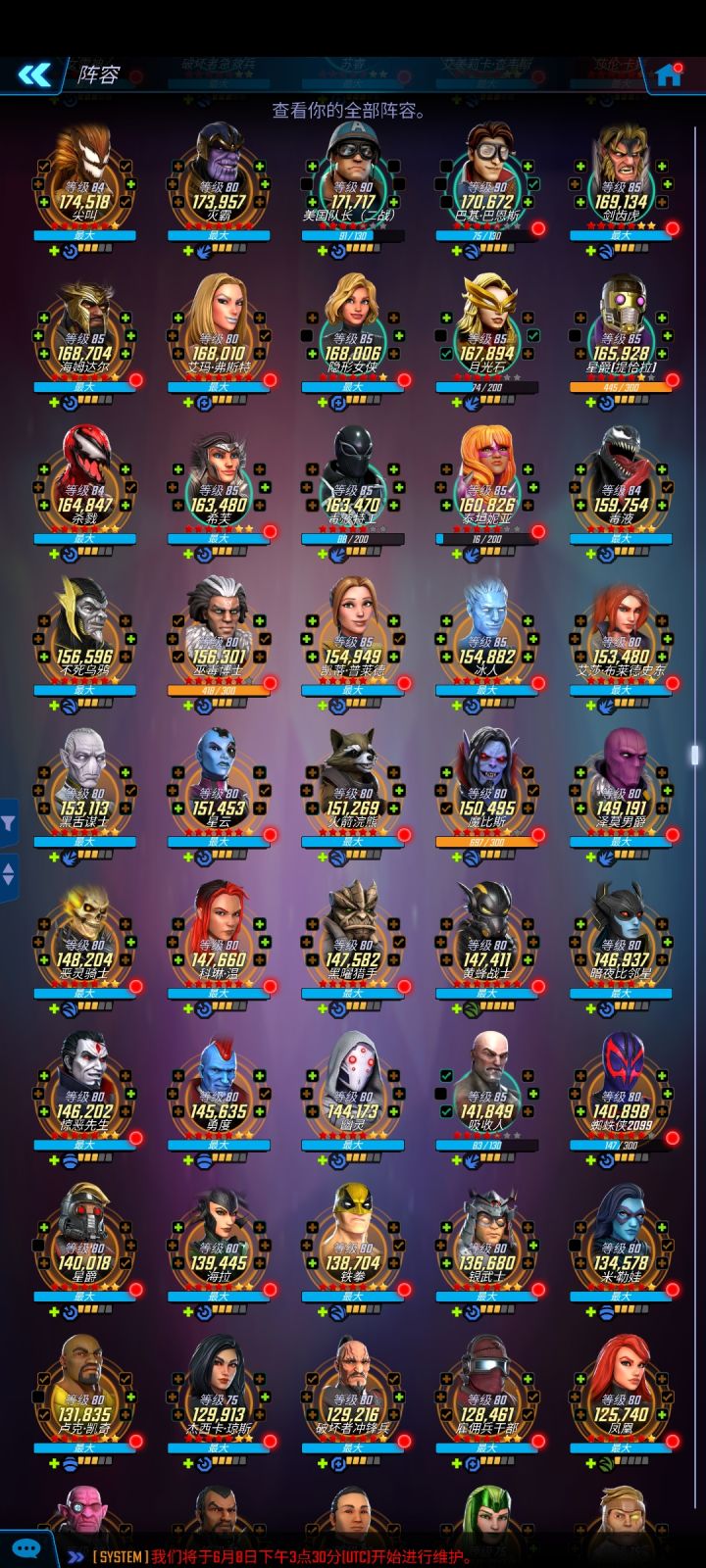 不知不觉也玩了2年多了,在线700多天,死侍和惊队都让我练得妥妥的。目前攒金星币打算给死侍买个满星。别说什么死侍不过是第三梯队的人,我粉他啊,没办法。而且我真心觉得他2技能那跳劈的一下子蛮厉害的。下面是我截至到目前的所有角色。在慢慢练,说实话我是一个非常佛系的人,所以才练得五花八门。群里在更新5.0之后出的那个天梯表,话说我有点儿没太看懂。为什么苏联大胡子是神级的?说实话我练花了好几个……唉,材