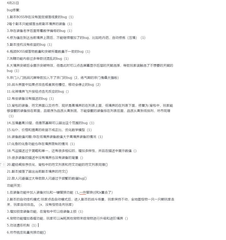 1.副本BOSS存在没有固定掉落线索的情况2.炼气期副本掉了金丹境装备,不合理3.存在装备后面带着数字编号4.突破境界UI显示错误bug5.修为值在到达上限值后应该还能继续修炼(这块我做了压境机制的,不知道为啥失效了)6.加入装备对比和一键替换功能7.挂机收益修复和优化8.瓶颈BOSS掉落物数量和突破所需数量不一致9.洗髓功能UI