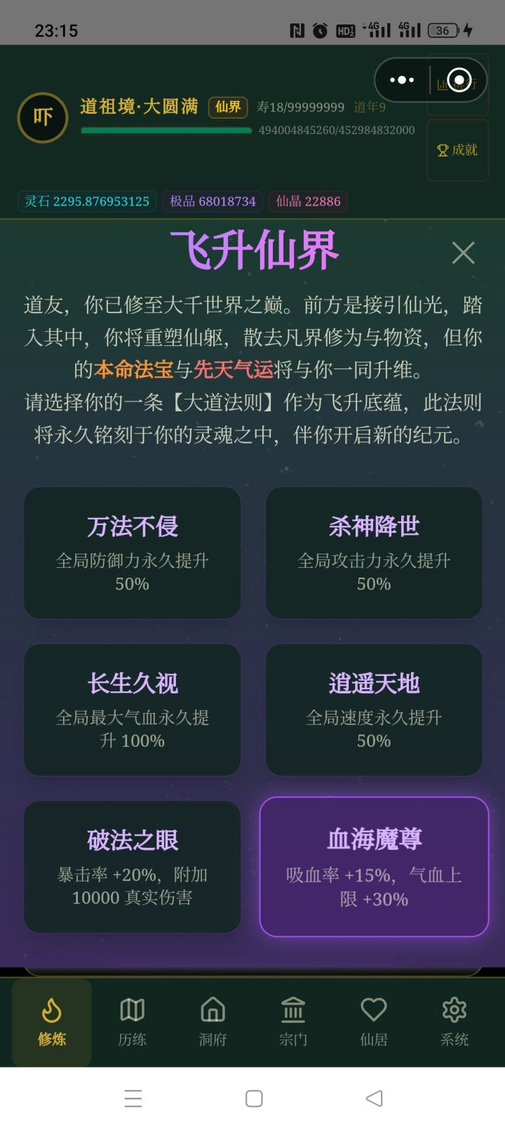 这款游戏目前连半成品都算不上,问题bug很多,所以给每一位玩家说一声对不起,个人力量有限。我初高中非常沉迷修仙小说,那会还接触了几款非常优秀的文字修仙类游戏,如今打算自己圆梦我打算制作一款单机无氪金入口的文字修仙游戏,为爱发电,休闲挂机向现在的问题包括但不限于:1.数值平衡问题2.内容单薄3.大大小小的bug但:1.即使每天实习到晚上11点,回家后也会继续开发改进,一天一小更,三天