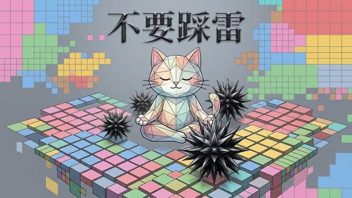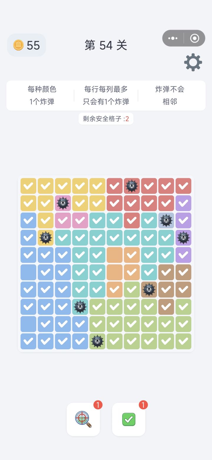 如图1,第54关第3行9列和4行10列的雷相邻了,并且第4行出现两个雷,这就导致第5、6、10三行中只有两个雷,有一行没有雷,最后两颗雷的位置无法判断之前41关也有bug,第一列出现了两颗雷,如图2