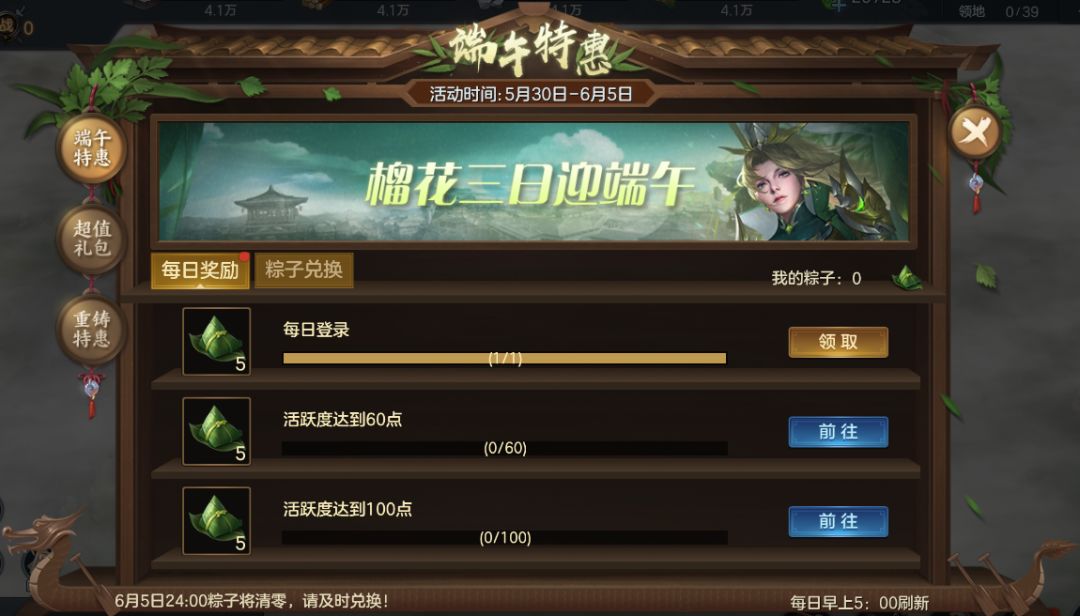 端午节是中国四大传统节日之一,又称端阳节、龙舟节、天中节等,源于自然天象崇拜,由上古时代祭龙演变而来。端午节有一个标志性习俗便是食粽。 端阳重午,万物方盛,为犒赏征战疆场的将士,我们为各位君主准备了香喷喷的粽子以及端午特惠活动,更有全新武将即将登场哦~ 以下为大家正式介绍九州劫端午活动: 活动1:粽子飘香-每日奖励 活动时间:5月30日10:00-6月5日24:00 每日满足以下活跃: (1)上线