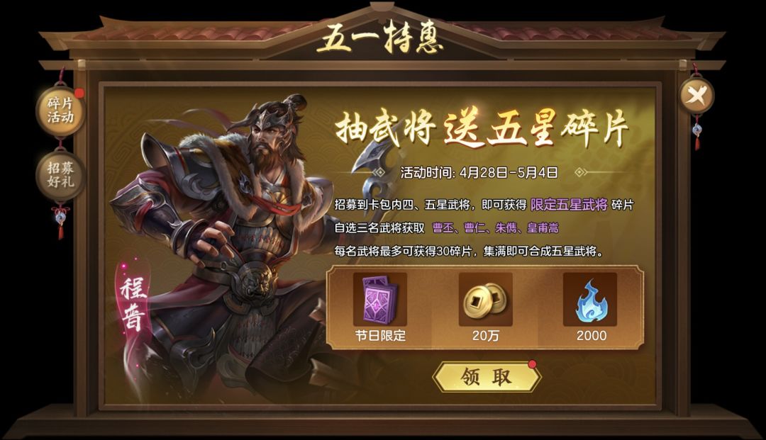 五一长假将至,《九州劫》也准备了五一特惠活动,全新武将程普即将登场,让我们一起来看看吧~ 五一特惠活动介绍 (1)4月28日-5月4日期间,1-202服的君主登录即可获取活动限定卡包、铜币以及将魂。 (2)4月28日-5月4日期间,活动卡包内招募到四、五星武将即可获赠限定武将碎片,每名武将最多可获赠30碎片。且玩家可从若干武将中选择3个武将作为获赠武将碎片,且抽取限定卡包过程中可随时更换获赠武将碎