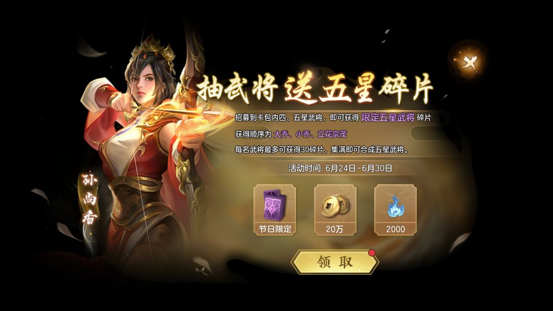 春去夏至,又到了一年当中最有活力的时节,我们也为各位君主准备了夏季特惠限时活动,全新5星武将法正即将亮相,让我们一起来看看都有哪些内容吧~ 夏季特惠活动介绍 (1)5月26日-6月1日期间,1-206服的君主登陆即可获取活动限定卡包、铜币以及将魂。 (2)5月26日-6月1日期间,活动卡包内招募到四、五星武将即可获赠限定武将碎片,每名武将最多可获赠30碎片。同时玩家可从若干武将中选择3个武将作为获