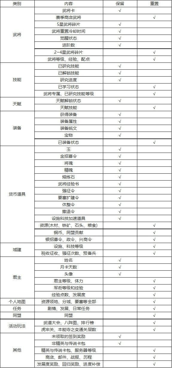 133-152区S4全新赛季将于2023年5月22日开启! 一、奖励规则内容 1.根据君主们以下内容结算为相应威望奖励,可全新赛季的赛季商店内购买各种物品: (1)国战历赛季君主的个人荣誉排名和所在阵营的排名 (2)内城建筑以及科技等级 (3)武将等级与武将技能等级情况 (4)剩余同盟贡献/储备贡献情况 奖励发放的方式和时间:新赛季开放当日奖励将会通过邮件形式发送给各位君主。 2.对君主在设施、科