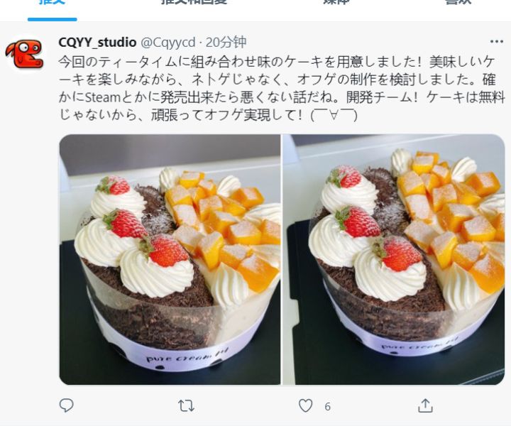 日推今天发的,大致翻译为:今天的下午茶是一个混合口味的蛋糕。一边吃蛋糕,我们一边在考虑制作单机版游戏。估计在steam上发布吧,开发组,蛋糕不是免费的,努力现实吧!难道之前的许愿要实现?