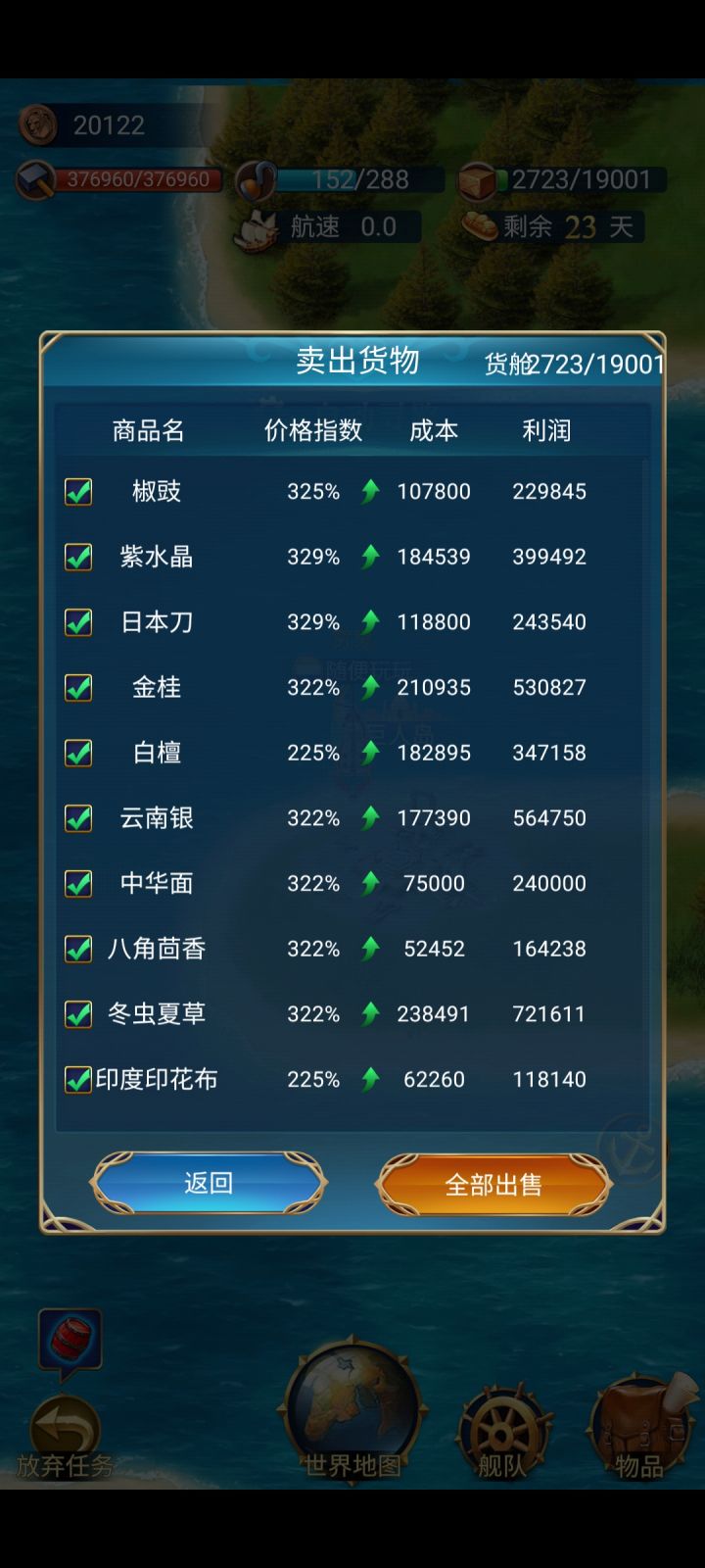 ⑥交易系统:这是游戏的其中一个核心玩法,但基本只针对于前期,前期精打细算,通过不同港口之间的差价低买高卖,兢兢业业赚钱,航海过程中损失了货物很伤心。但是后期,基本就没有意义了,拉一次远洋货物几亿的纯利润,钱多的用不完。这个系统仍然存在信息不对等导致玩家无法得到直观的策略。比如101%物价的寿山石,0税收以225%物价卖出去,为什么利润不是成本的1.25倍【(225%-101%)/101%】?我计算过,寿山石2022个101%买入显示成本为1.73亿,225%卖出利润显示4.59亿(2.65倍利润)。请问这些数据是如何来的呢?你不直观的告诉玩家这些数据怎么来的,玩家怎么知道买什么东西好呢(寿山石只是举个例子,毕竟寿山石是大后期拉货的最佳选择)