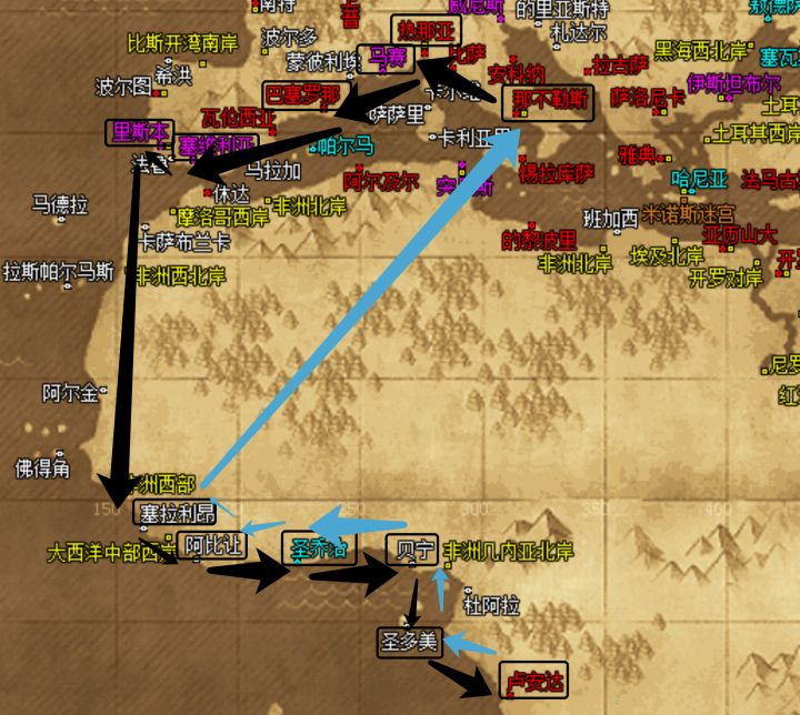 那不勒斯(全买)——热 那 亚(全卖全买)——马赛(全卖,除盐之外全买)——巴塞罗那(全卖,只买军火)——塞维利亚(只买军火)——里斯本(只买军火)——开始南下非洲,路