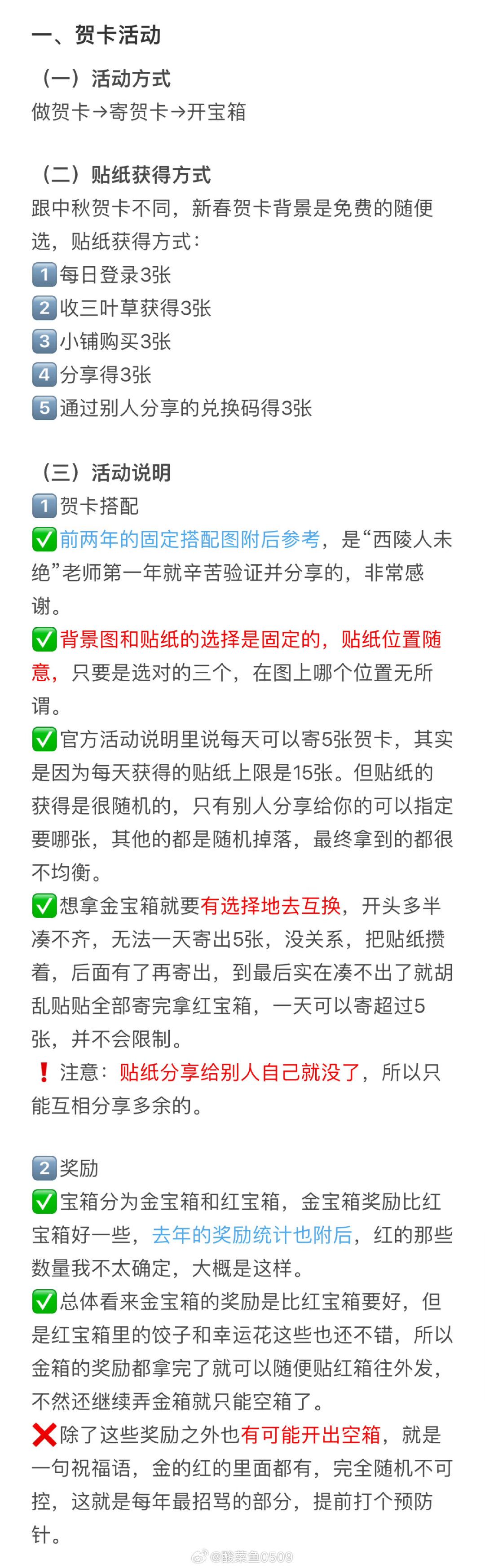 转载自酸菜鱼 这两年新春活动都搞得乱糟糟的,很招骂,我也很烦所以都没怎么认真记,好多东西是刚去扒拉的,可能不准确,而且也不知道今年有没有变化,先发着有问题再修改。 依旧感谢@西陵人未绝 老师的宝箱攻略 ⭐更新的其他内容: 1️⃣河南景点照+1 2️⃣1月节气照更新了下半月的腊八粥,上半月就没了;另外2月也更了一张,单看图要素不是很明确啊,我瞅着也像下半月的泡椒春笋,等用囤货跑一下看看再说