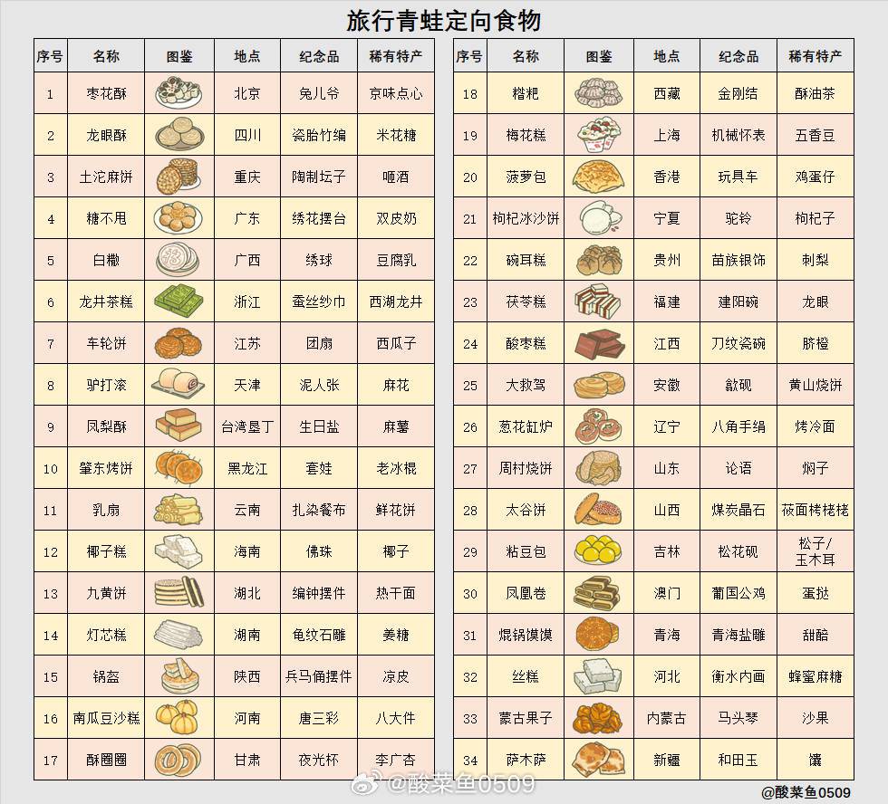 制作/发表:@羽兮虞兮 【禁止擅自修改内容、删除水印】 @羽兮虞兮: 共34个纪念品、50个特产(21个普通特产+29个稀有特产)。 五个月饼是中秋活动的纪念品,暂时无法获得;问号纪念品是吉林长白山的松花砚,由于目前目的地不包含长白山,所以无法获得。 纪念品、特产必须到达终点(目的地)后才有可能获得,纪念品获得概率问题看评论。 青蛙旅行距离越远(经过的路径点越多,每个路径点最多获得一个特产),获得
