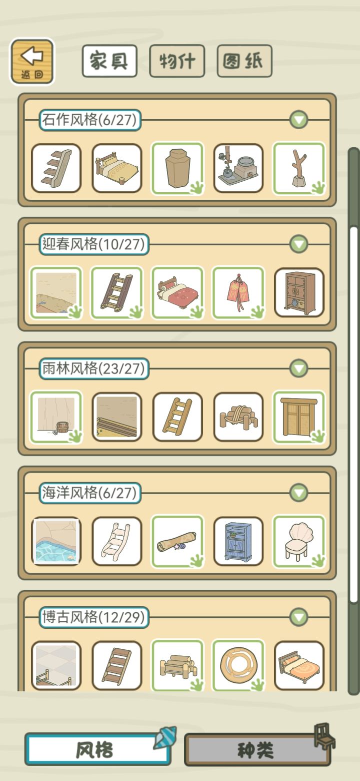 更新一下我的游戏进度!1,收集到100四叶草啦2,工具系列还差个棒针就齐了,雨林系列差4个家具做完3,海螺贝已买齐。岩纹石还差一个买齐。手工合页又买到了两个,做完就有五个堆肥箱啦家里现在长这样~没有干涉过呱娃子的选择~