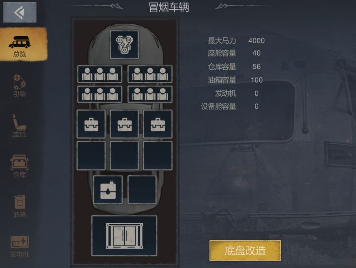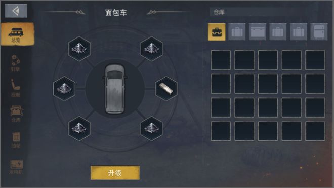 还记得之前讲的营车系统吗?今天小编我给大家接着介绍营车的部件改造,对营车部件改造还不是很清楚的,快跟我一起来看看吧。营车一共有引擎、座舱、仓库、油箱、发电机这5个部件。【引擎】引擎一共分为四种,分别是V22引擎、V100引擎、B46引擎、F115引擎。每种引擎对应着不同的马力,如下图:初始车辆的引擎是需要先修复的,修复成功后才能对引擎进行升级。【座舱】游戏默认开启第一排的座舱。座舱提供