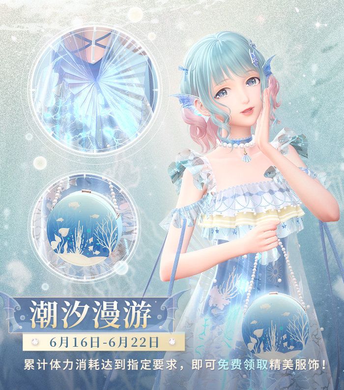 🌸福利一·潮汐漫游 珊瑚丛间游弋的鱼群,是来自蔚蓝海洋的问候。 6月16日,参与【潮汐漫游】限时活动,即领精美福利衣服! 活动时间:6月16日 5:00-6月22日 23:59 活动方式:活动期间,累计消耗体力达到一定数量,即可领取包括连衣裙【潮汐漫游】等本期稀有清新衣服部件。 *搭配师需在活动持续期间内及时领取奖励,活动结束后奖励将不可领取。 🌸福利二·周末助力 活动时间:6月11日5:00-6