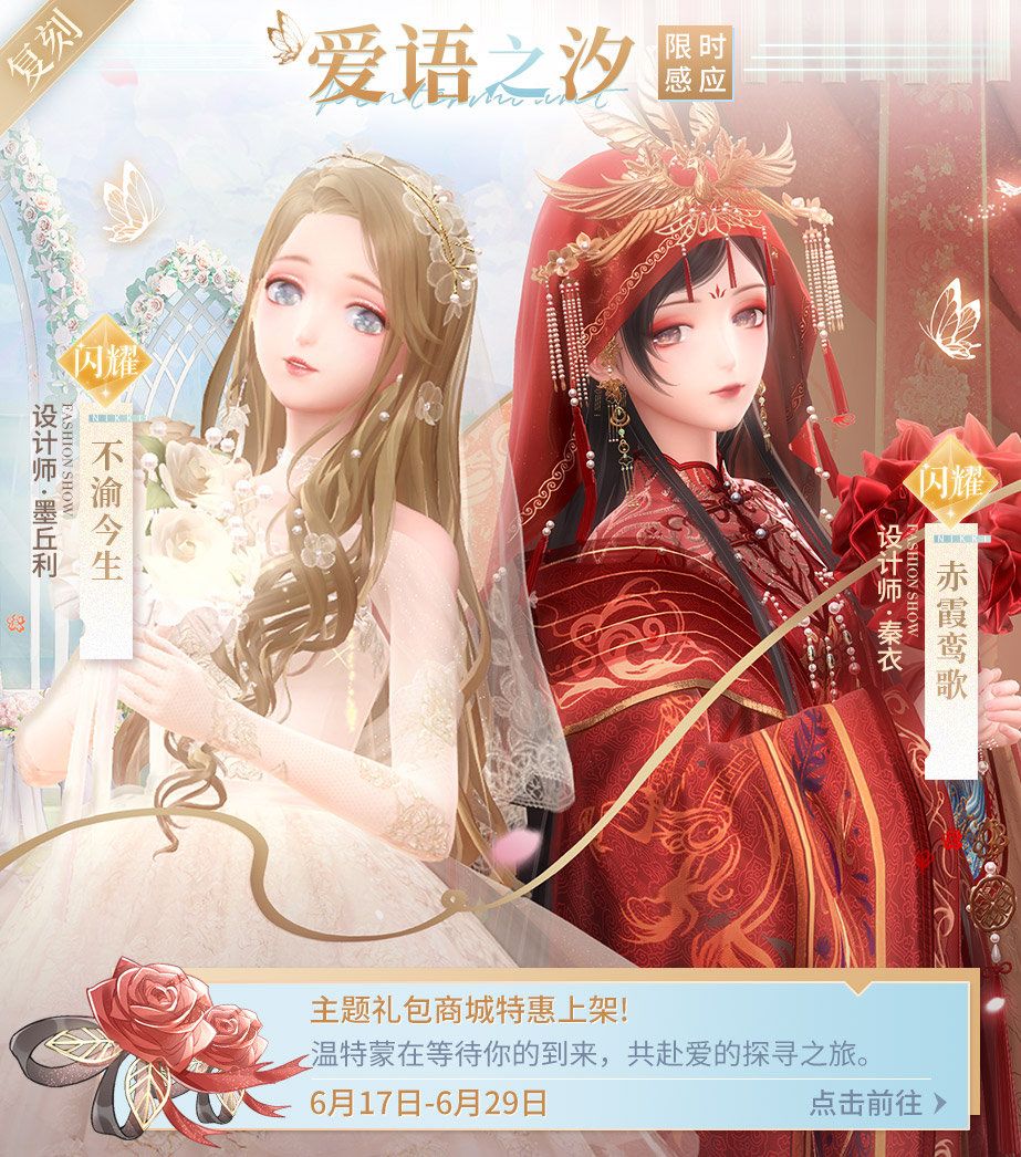 重回温特蒙婚纱秀,与暖暖共同见证爱的誓约! 6月17日,参与限时活动【爱语之汐】,感应获取闪耀套装【不渝今生】以及闪耀套装【赤霞鸾歌】。 套装动作【盛放恋心】可在完成【不渝今生】套装及设计师之影收集后通过【成就】获取;套装动作【蝶舞唤花】可在完成【赤霞鸾歌】套装及设计师之影收集后通过【成就】获取。 活动时间: 活动时间:6月17日更新后-6月29日23:59 兑换时间:6月17日更新后-6月30日
