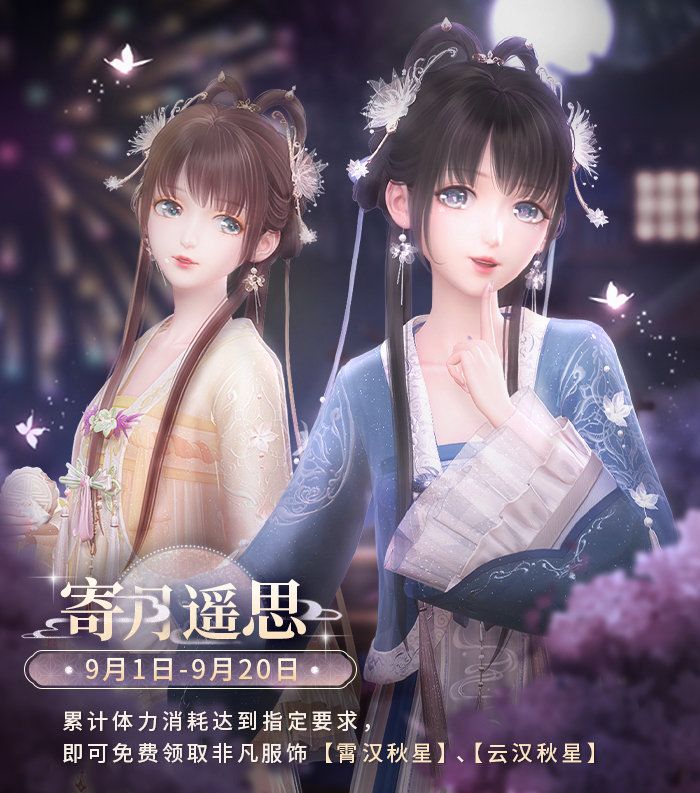 泛舟秋夜的湖上,远望如画山水,低头掬一捧月光。 活动一·寄月遥思,获取非凡服饰 活动时间:9月1日更新后-9月20日23:59 活动方式: 活动期间,体力消耗达到指定要求,即可免费获得非凡服饰【霄汉秋星】、【云汉秋星】。 活动二·节日邮件,登录领粉钻 9月10日5:00-9月12日23:59期间登录游戏,可领取含【粉钻*200+金币*18888】的福利邮件。