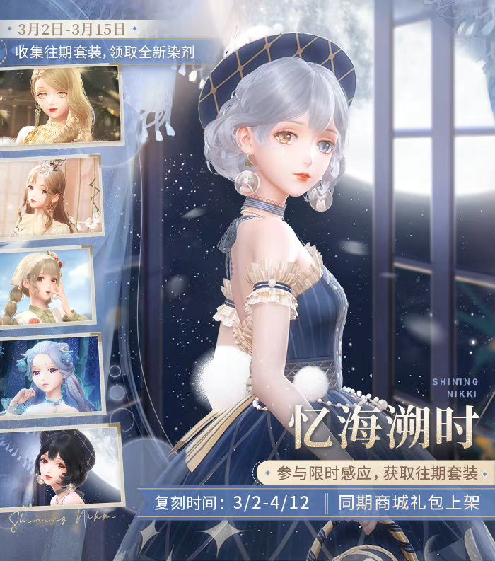 【预告】忆海溯时,限时复刻活动开启! 回溯忆海时光,收集心仪套装。 ❤️3月2日更新后,心之门限时开放复刻套装感应活动,指定套装收集一定部件可获得全新染剂奖励! ❤️活动一:心之门限时复刻感应活动 ⭐活动时间:3月2日更新后-4月12日23:59 ⭐本期开放套装: 非凡性感套装【墨丘利·燃金时代】、非凡性感套装【墨丘利·黎光序曲】、非凡清新套装【暖暖·绿野牧歌】、非凡性感套装【莉莉斯·绒兔