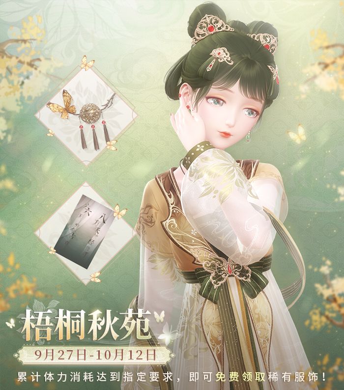 从画阑外飞来的一只蝴蝶,惊扰了春的幽梦。 9月27日更新后,参与体力消耗活动,即可免费获取稀有服饰及贴纸模板。 活动时间:9月27日更新后-10月12日23:59 活动方式: 活动期间,体力消耗达到指定要求, 即可免费获取稀有服饰【梧桐秋苑】及贴纸模板【洪荒天地】。
