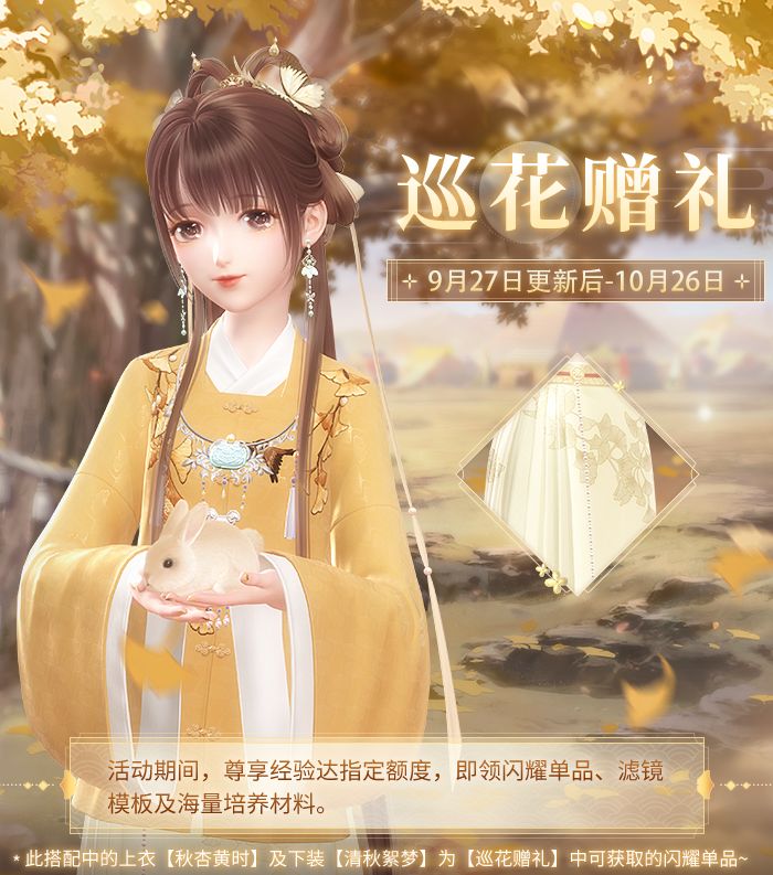 这以丝线替代工笔描画着银杏叶间跃动的鸟雀,别有一番风韵。 活动一·巡花赠礼,参与获取丰富资源! 尊享经验到达指定额度即可获得闪耀单品、滤镜、光照、贴纸背景及海量培养材料! 活动时间:9月27日更新后-10月26日23:59 活动方式: 累计尊享经验达60,赠礼含闪耀单品【秋杏黄时】,幻之券以及既定钥匙·普通; 累计尊享经验达120,赠礼含闪耀单品【清秋絮梦】,星钻以及既定钥匙·稀有; 累计尊享经验
