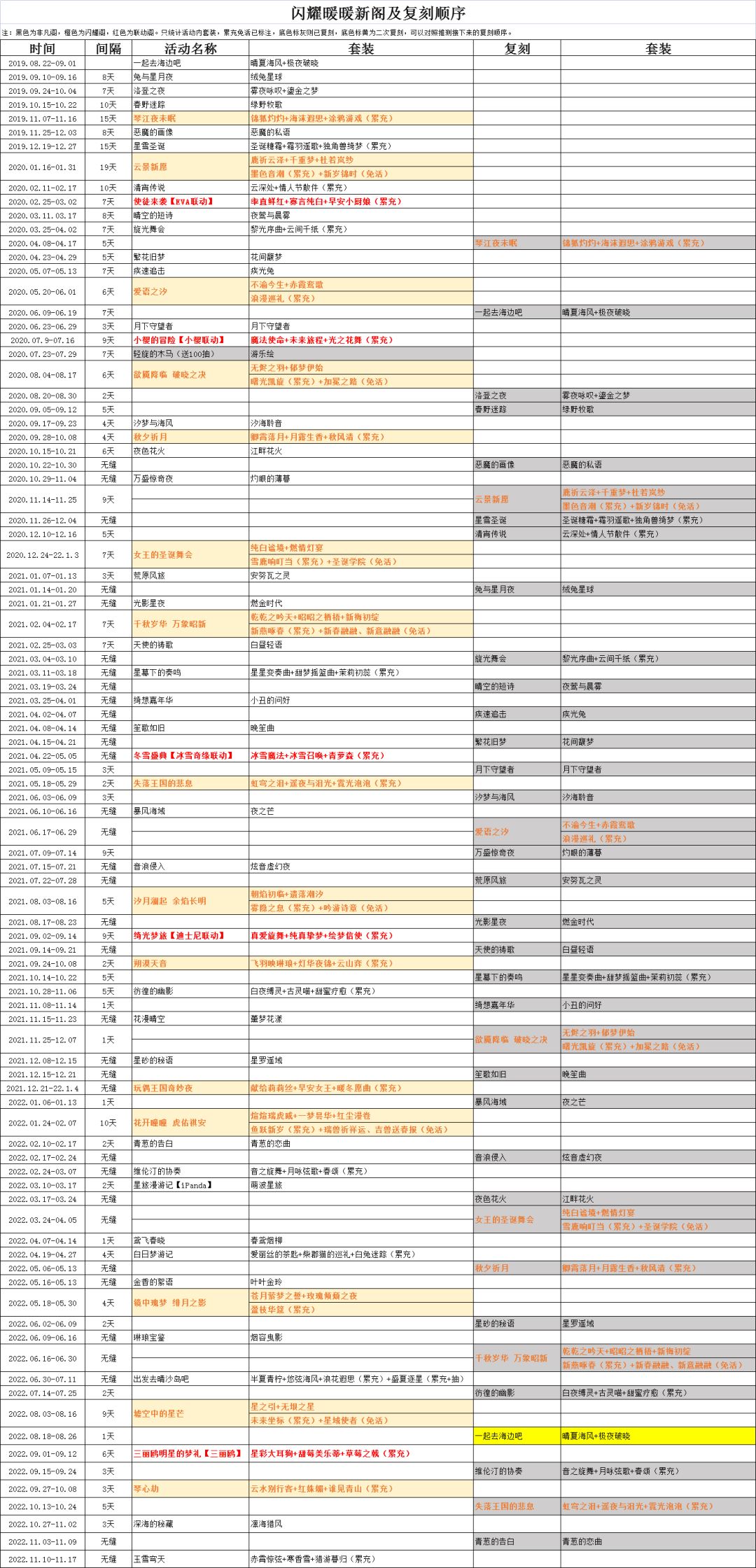 这个底表不是我原创的,自己建了文档后缓慢更新,只记要抽的非凡阁闪阁及累充。 可以看看当做参考,不过小洋伞我从今年五月份奶到现在都没复刻(笑)。 月更