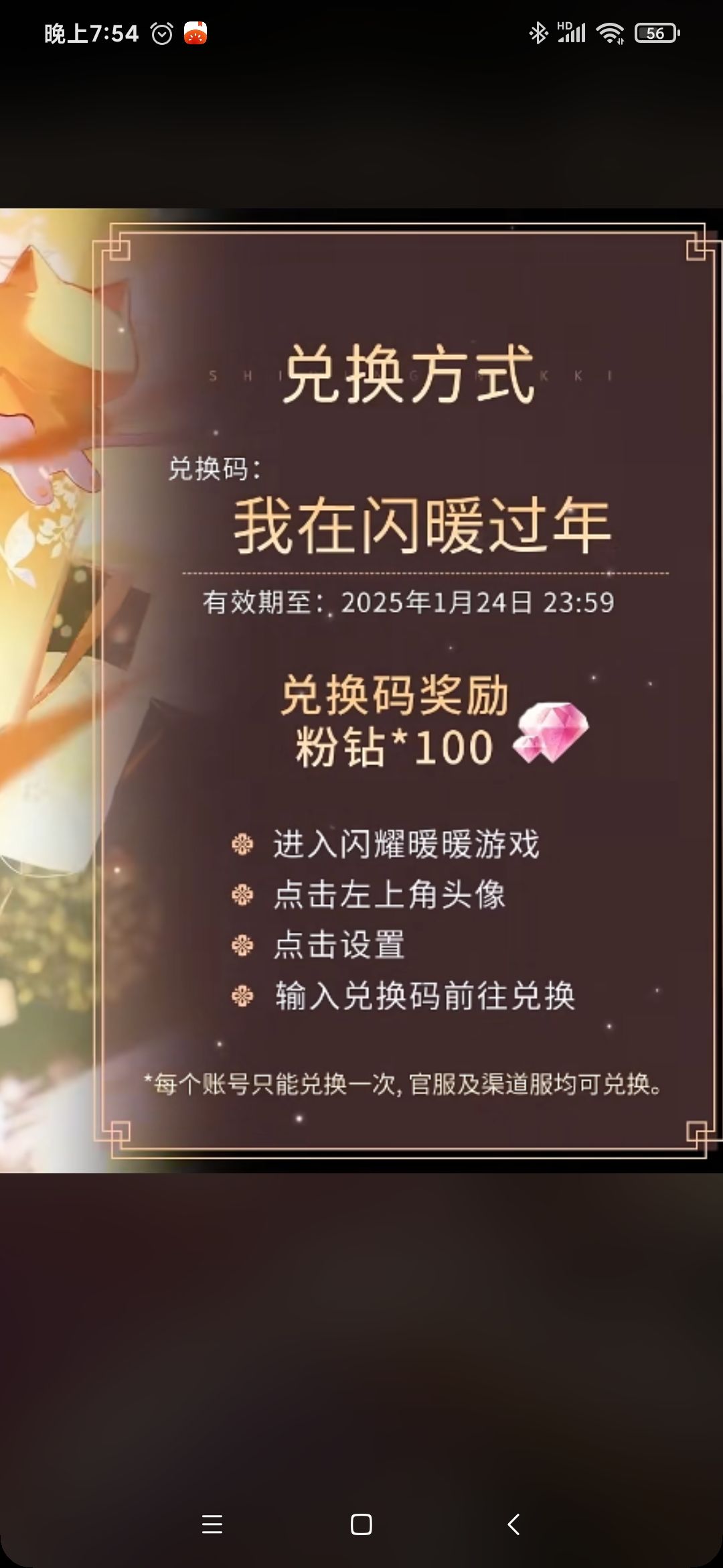 我在闪暖过年 我要在闪暖过年 我就要在闪暖过年 总共三个兑换码,每个兑换码100粉钻,24号过期#闪耀暖暖 #闪耀暖暖兑换码