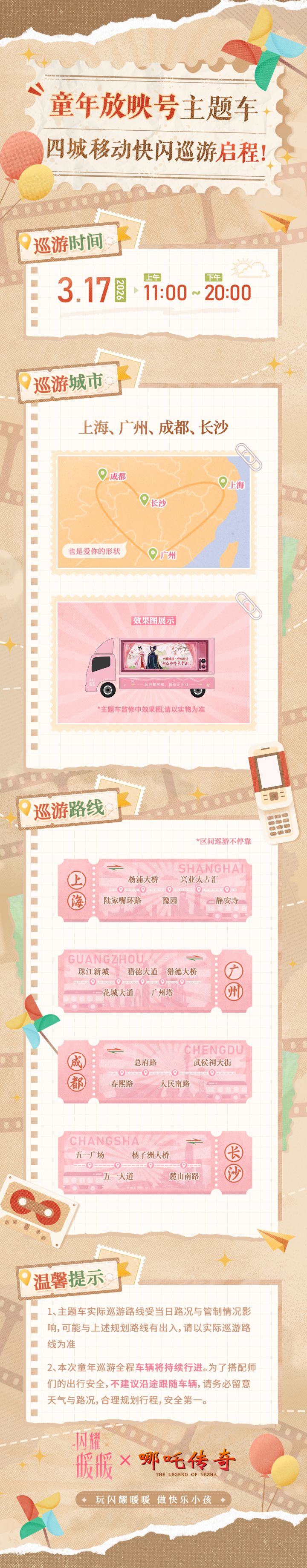 🎈玩闪耀暖暖,做快乐小孩🎈闪耀暖暖×央视动漫《哪吒传奇》联动主题车巡游,即将开启!童年回忆满载,暖暖向你而来!🍬巡游时间:3月17日11:00-20:00🍬巡游城市:上海、广州、成都、长沙,于地图上凝结成心点击图片,查看巡游路线,在最美好的时刻,和暖暖相遇吧!【温馨提示】1. 主题车实际巡游路线受当日路况与管制情况影响,可能与上述规划路线有出入,请以实际巡游路线为准。2、本次童年
