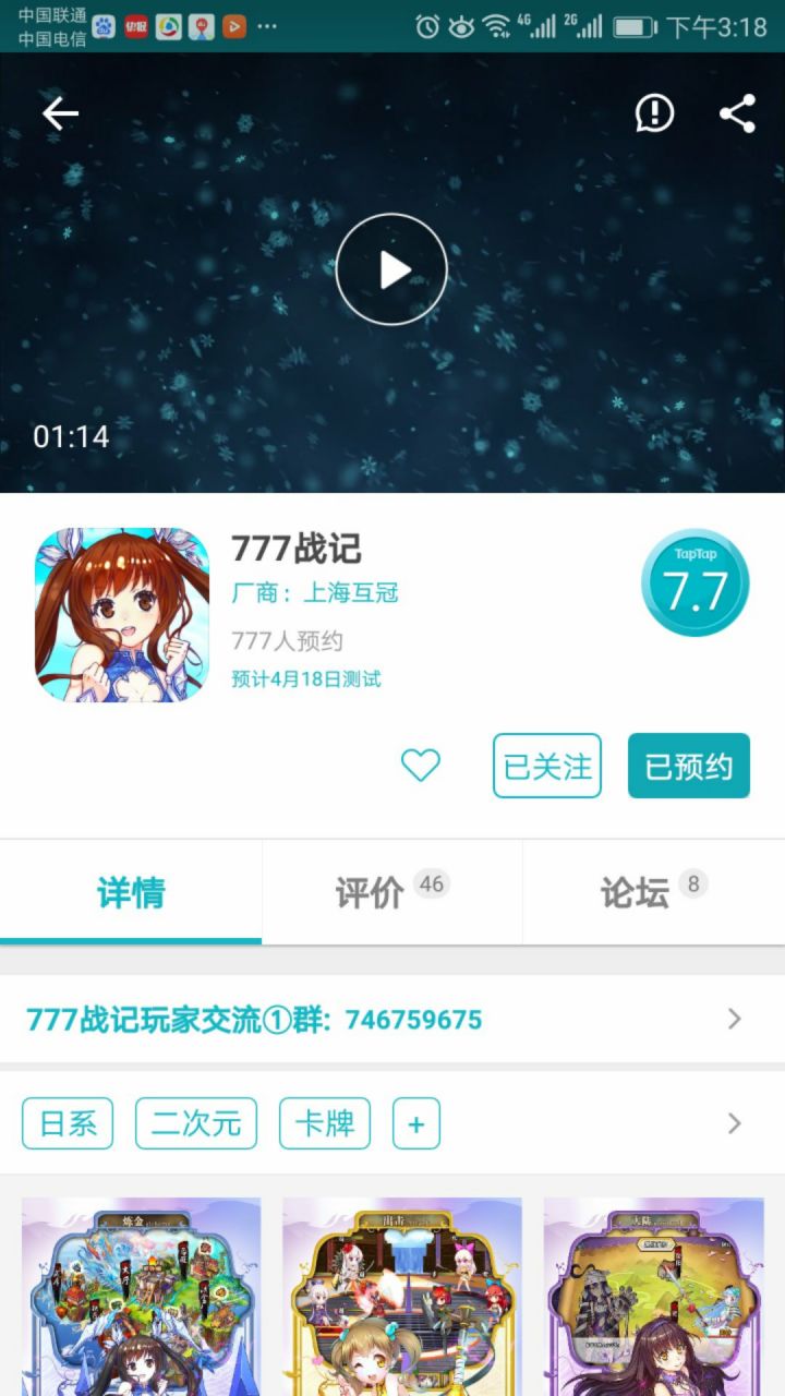 最近看各位大老爷们在聊“777”梗,为此7妹帮大家争取到福利,截图发帖活动,下面请看详细说明。活动规则:预约人数达到777时(仅这一刻!),1、在taptap手机客户端截图游戏详情页(需看到预约人数哈)2、在本论坛发帖说明参加活动(附上截图哦)3、发帖时间最早的前三名玩家可获得对应奖励京东卡(嗯,刚好想买个手办ヾ(✿゚▽゚)ノ)活动奖励:第一名发帖玩家(100rmb京东卡)第二名