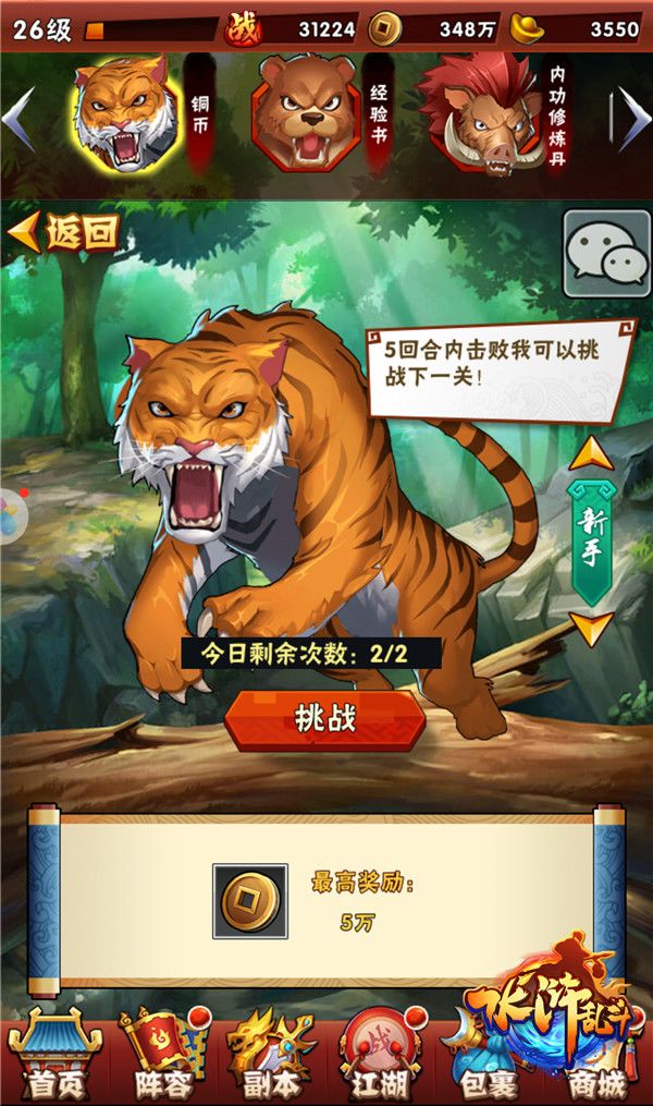 都说“三碗不过岗”,《水浒传》里武松喝醉之后空手打死一只吊睛白额虎,那么《水浒乱斗》中的豪杰们醉闯景阳冈会发生什么事情呢?当然是退老虎、斗狗熊、杀野猪,收获丰厚奖励啦!玩家达到26级后,即可解锁【醉闯景阳冈】玩法,选择对应资源的小BOSS进行挑战,成功后就便能领取奖励。每个小BOSS都有不同的难度划分,难度越高奖励越丰厚,每个难度可重复挑战两次,因此多次挑战就能解你某个资源短缺的燃眉之急啦!加