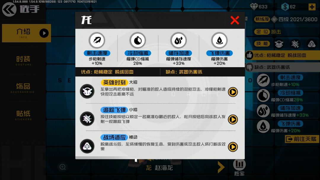 各位玩家们好! 第一次写攻略还没打什么草稿,张口就来昂,步入正题。 刚接触这个游戏是A测那会,B还有C测都玩了,开服前最后一次测试也就玩了一会吧,现在终于开服了。各位等了那么久,内测好多角色都没出现在正式服里,那么这次我就简单的介绍一下这些来自王牌战士的选手吧。 第一位选手:龙 定位:游击 a评价:喜欢突突突,武器稳定性强,射速快,持续输出,虽然很脆,但遇上手速快的玩家你还不一定刚得过他。 b小招