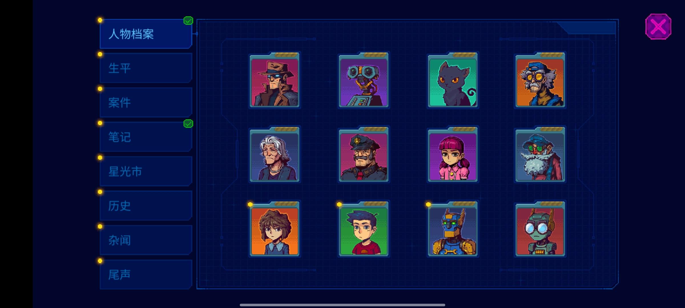 通过推进剧情,你将一步一步的走进这个宏大的绘声绘色的赛博像素世界,阅读了解过往的案情,十三年前的连环凶杀犯,我们的“老朋友”诺瓦重现人间,一步步的将你诱导进陷阱,玩家一路破解各种机关,搜集各种线索发现背后隐藏着一个巨大的阴谋。