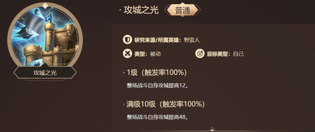 本攻略为黎明终测整理的心得。技能对英雄实力的提升非常的大,今天我就来为大家推荐一些适合像我一样的平民,必须要有的好用又便宜的技能。 普通 普通品质的技能效果都比较一般,在后期往往会被替换掉,但有三个较强的技能,可以考虑升级下,以备不时之需。 攻城之光 研究来源/所属英雄:野蛮人 技能类型:被动 技能效果(10级):(触发率100%)整场战斗自身攻城提高48。 推荐理由:能够提升攻城属性的技能并不多
