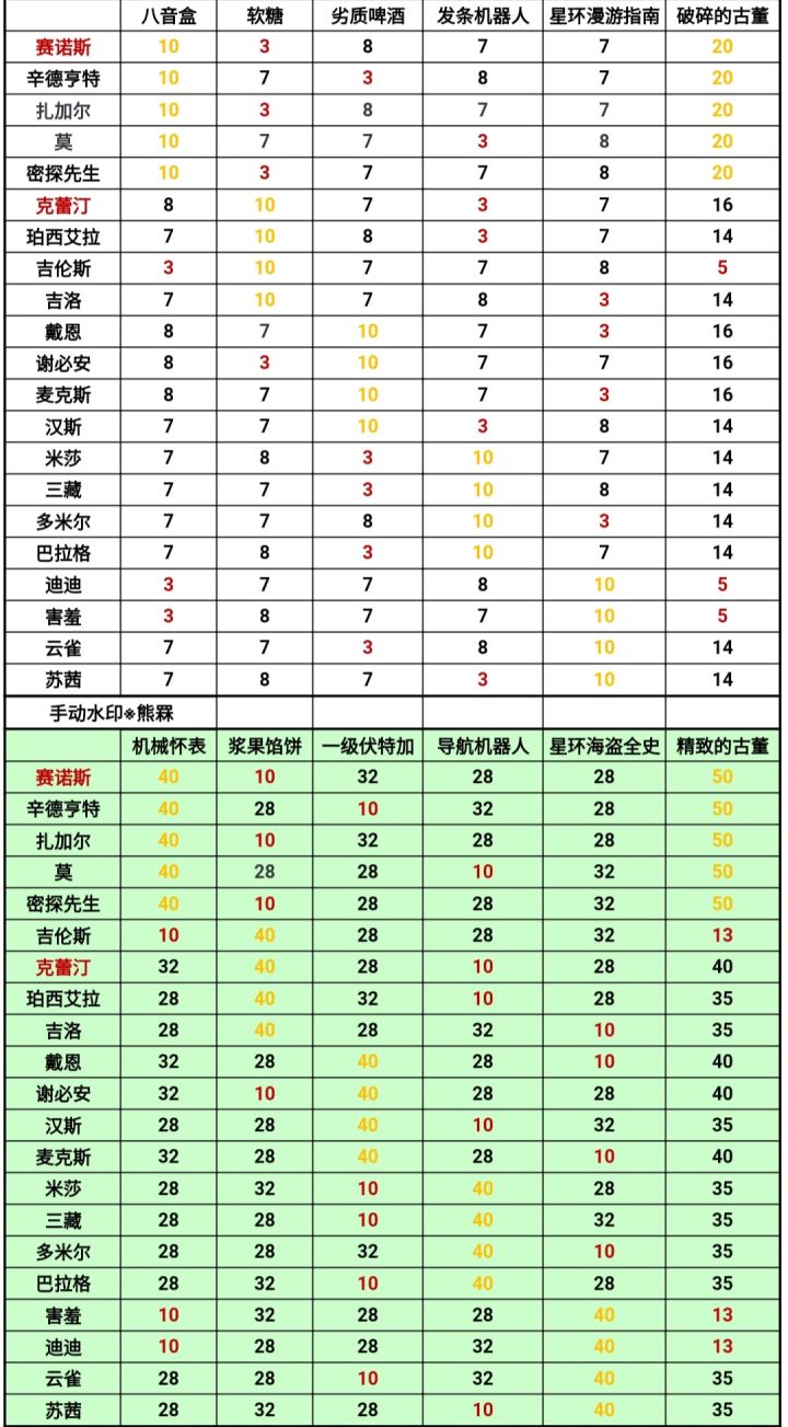 探索点3——【阿米特—伯雷戈—北库奇利】由于该星球存在探索度。那么我直接按照dp来讲述。我仍然采用的【主角 戴恩 害羞 苏茜 】阵容,虽然慢,但是挺稳。阵容可随意搭配,不拘束。地图如下:说明:①和②为门锁,最后可打开。③④⑤为传送台『漏了一个最上面的问题不大』,后续可来回传送,与探索度相关。顶部方块为剧情必要npc,多次涉及。右下角方块为门锁,不可打开。首先我们接到的是主线任务『28号dp』:我按照顺序来讲述探索度,有相关的会联系讲一下。『29号』探索帮助逃脱兵役『30号』凑集食物(3浆果馅饼 1软糖 共10重量)『31号』幽深地穴(图片中所示阵容可过)『32号』两处信标【难】左下角boss如下,相对简单,阵容自行搭配:右下角达斯克推荐阵容【主角 云雀 使徒麦克斯 游荡害羞】要点:开局使徒麦克斯触发天赋,二技能牵制弹,减速boss;开局游荡害羞三技能,读条定神,先手放出;开局主角蓝盾,然后嘲讽;开局云雀等着被复活。『33号』繁衍地【难】,建议先在上游投毒『35号dp』,否则boss会自动回血,相关毒药配方后续会讲。繁衍地在图中所示位置。『34号』配方手稿,在问号木筏救人中有几率开出【难】,如下:『35号』上游投毒,建议先投毒再摧毁繁衍地。投毒点为地图顶部两个感叹号。『36号』解锁文档,问号中触发。『37号』奥灵飞船。首先要在帮助维修信号传送器『45号dp』的过程中,解锁该讯息『39号』【难】:然后才能触发36,37号探索,图示位置:这个很好打。苏茜天克他们。然后我们完成37。以及36号文档从这里解锁。『38号』【难】坩埚配出毒药。首先我们要救出坩埚,然后按照配方顺序,即心脏,心脏,木材,能晶核依次放入,即可获得毒药。『39号』上有,联动36,37号探索。『40号』分红,兵役逃脱成功,再次回去对话,可以触发:『44号』品尝5次。————————————————————————————此外,npc小女孩【不同选项导致不同结果】,选择让她留在城内,最后可以得到金色🎁『如下图』;让她出去,会得到蓝色人类简史。最后附上日常boss图鉴: