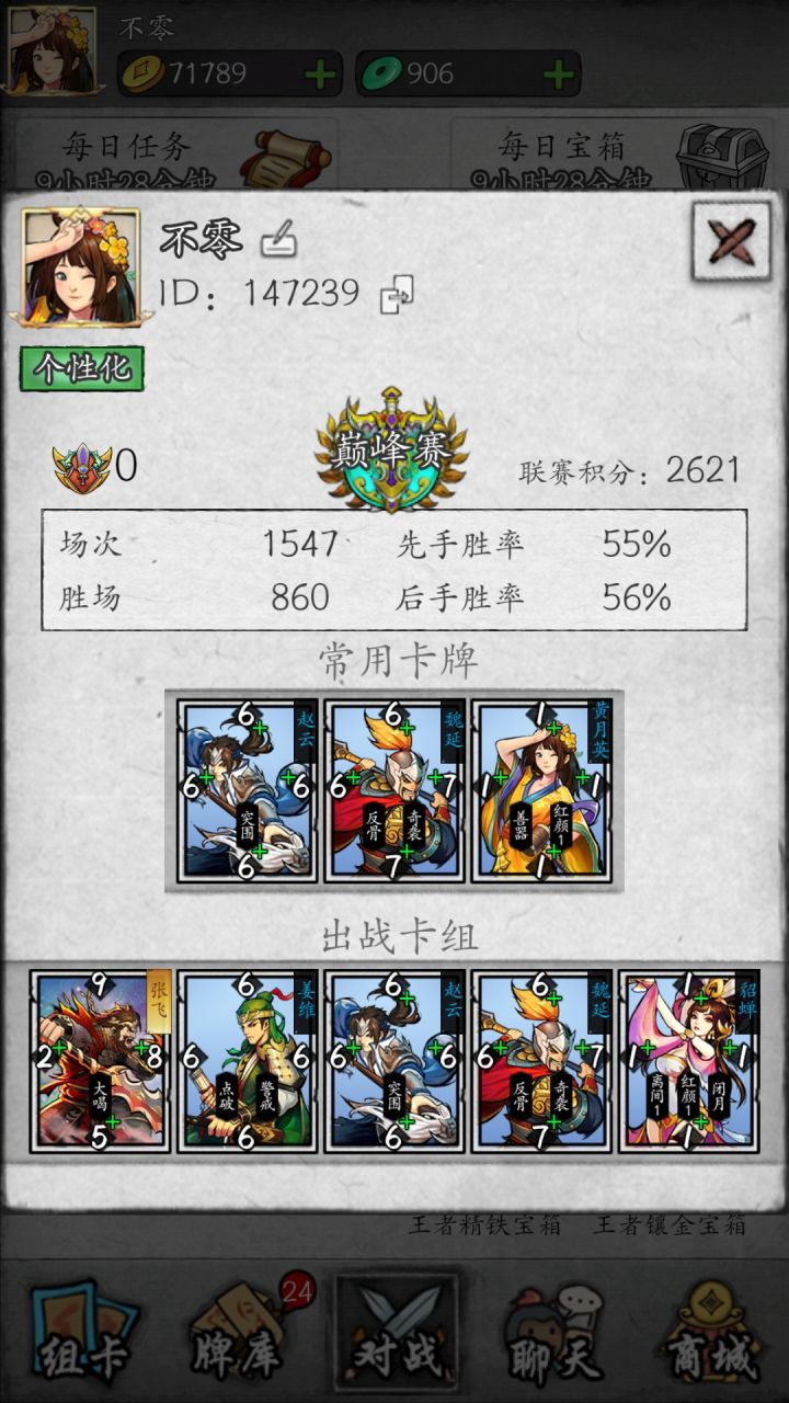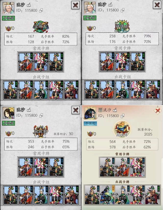【第四局、第五局对比】今天要说的是倒数第二手的时候的选牌,正好今天有两局比较经典的例子,就整理给大家了。一般来说倒数第二手是很难受的一手,因为最后一手是对面的,所以你必须大致判断对方还有什么牌,如何出牌才不会被反打,而且你同时还必须保证这一手结算结束后场上至少占领了五格,否则就可以直接投降了。先来看第一局在我可以选择上貂蝉翻胃炎,或者上赵云翻郭嘉的情况下,我思考了许久,最后选择了赵云,原因是我预计对面在带了3个sp强力大哥的情况下,理应带一张沉默以弥补卡组短板,而貂蝉必被沉默怪吃,最终将导致失败,反倒是赵云对面更有可能解不掉,最后果不其然占稳了五格胜利。我同样的卡组又匹配了一局,同样是打魏国,在对方下了司马过后,我又陷入了思考,这次和上一局很是类似,但我想对面为什么要选择先下司马沉默呢,无非是为了保大哥不被姜维点破(如开车吕布等),所以如果我上赵云翻貂蝉,可能正中下怀。加上我本来张飞就沉默了一张,对面手上即使有邓艾也有一半几率没技能,所以我选择了貂蝉封1号位,最后胜利。有时候就是这样一手细节,就决定了成败。同样的环境,细微的差别却导致了不同的正确选择,可以说很玄妙了。