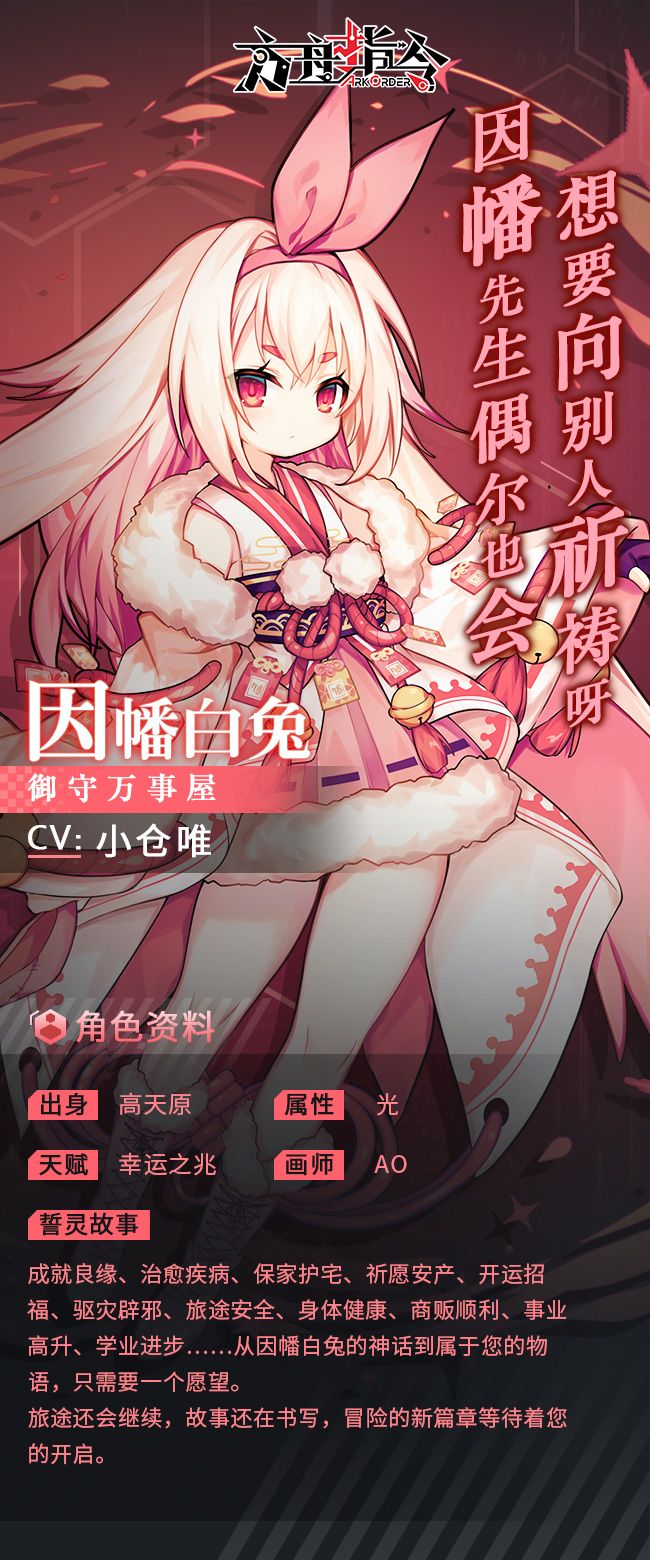 虽然不能给你带来亿万的财富、永恒的生命但若有幸得到她的御守无论是考试、姻缘,还是工作、健康……愿望都会在不知觉中灵验她不是万能的许愿机更不是诱使你付出代价的奇迹推销员但只要你是有缘人无论多么细小的愿望她都愿意仔细聆听、有求必应《方舟指令》全新誓灵资料释出:因幡白兔