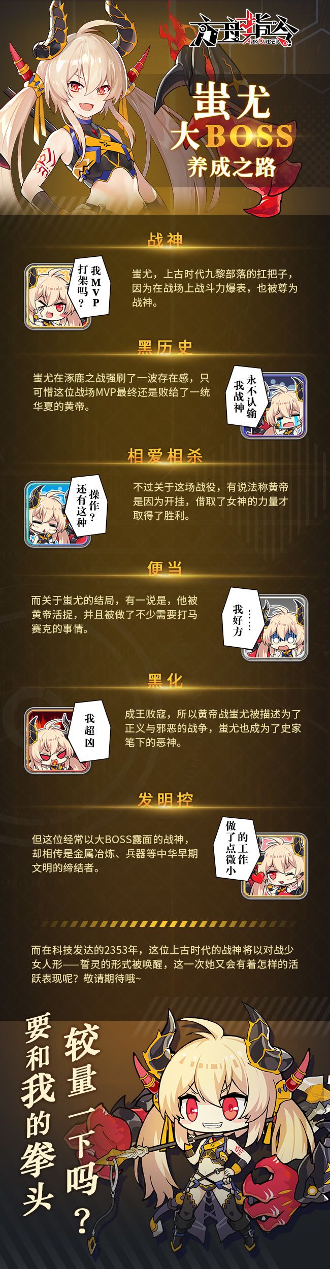 战场MVP为何突然陨落?中华三祖为何相爱相杀?昔日战神为何沦为大BOSS?这一切的背后是人性的扭曲还是道德的沦丧?让我们跟随下图走进蚩尤的内心世界~更多誓灵资料欢迎戳↓↓↓更多表情包欢迎加Q群: