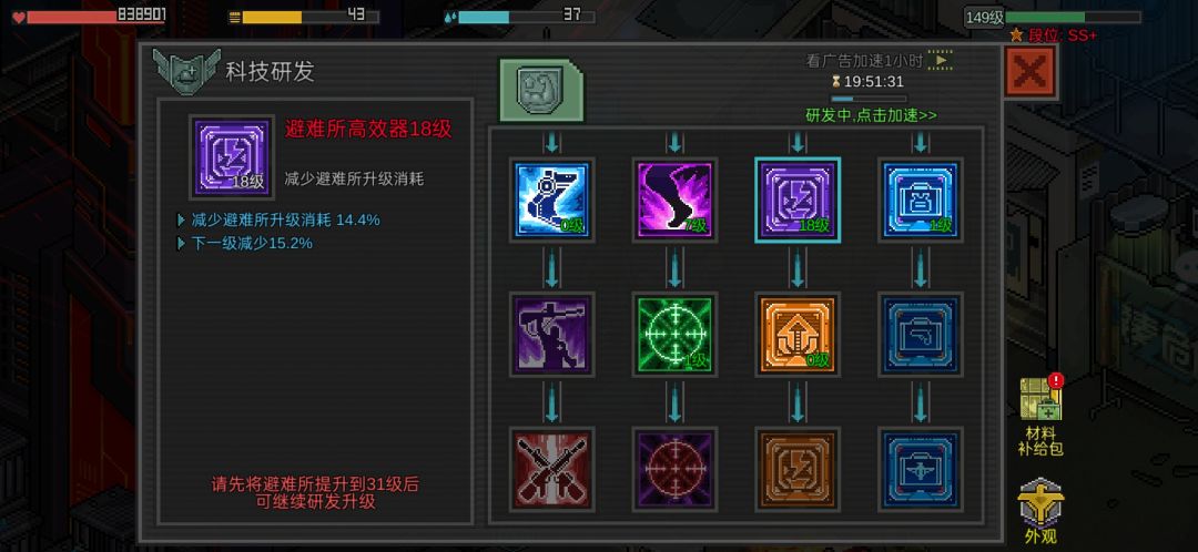 避难所研发建议优先第三条点满,能省大量的材料和时间(虽然后期不缺材料)。